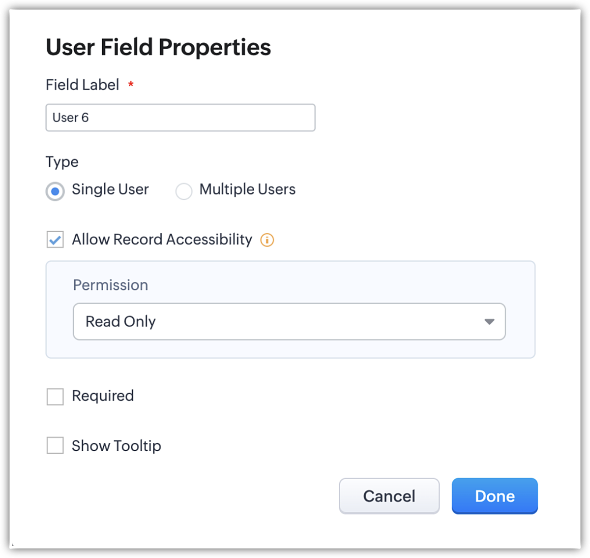 Tramite la modifica delle proprietà del campo , è possibile cambiare l'etichetta del campo e aggiungere un tooltip. È inoltre possibile visualizzare un'anteprima del tooltip.