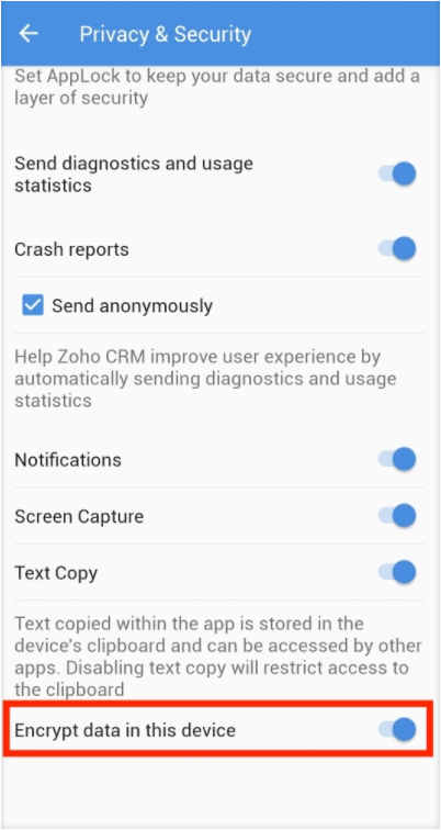 In Zoho CRM è possibile crittografare i campi personalizzati utilizzando AES. La crittografia dei dati non ostacola l'uso efficace e rapido di Zoho CRM da parte degli utenti autorizzati.