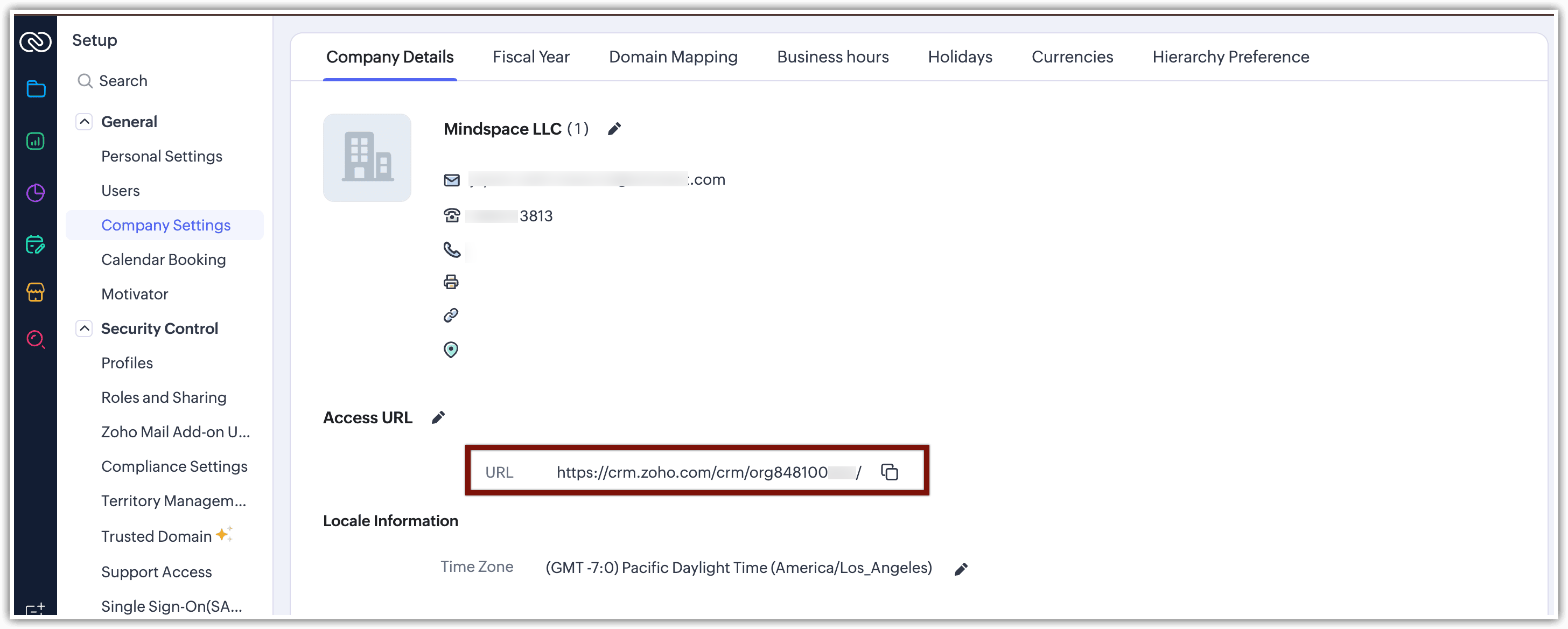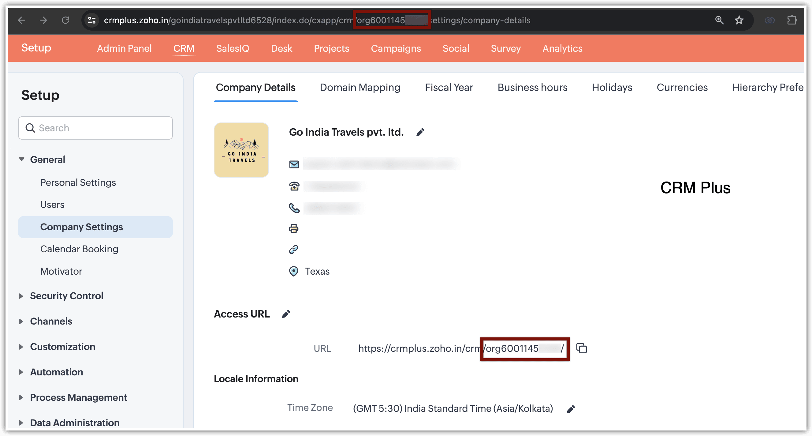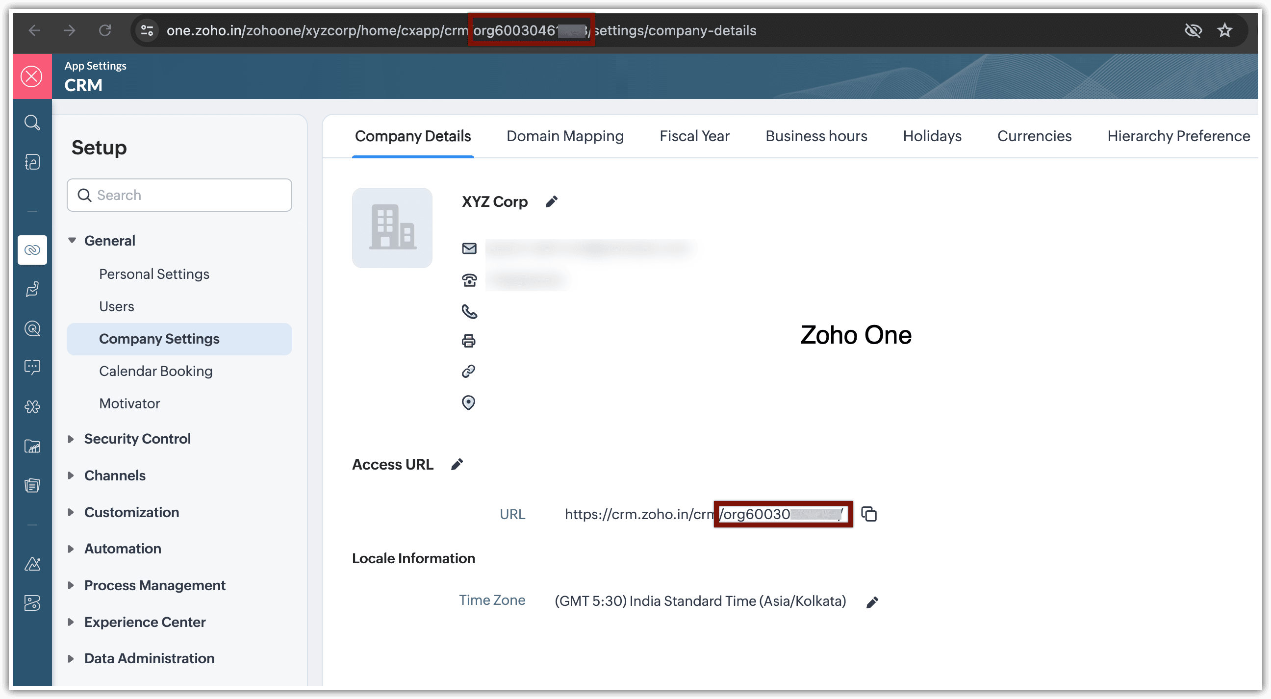 Per ottenere l'Org ID del proprio account CRM in Zoho One o CRM Plus, navigare su Setup > General > Company Setting > Company Details > URL > Org(numerico).