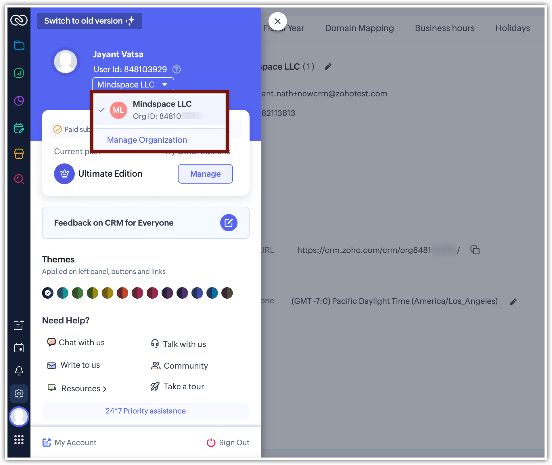 È possibile trovare facilmente il proprio Organization ID facendo clic sulla propria immagine del profilo nell'angolo in basso a sinistra dell'account CRM. Lì verrà visualizzato il nome della propria organizzazione. Fare clic sul menu a discesa per visualizzare il nome dell'organizzazione e l'Org ID.