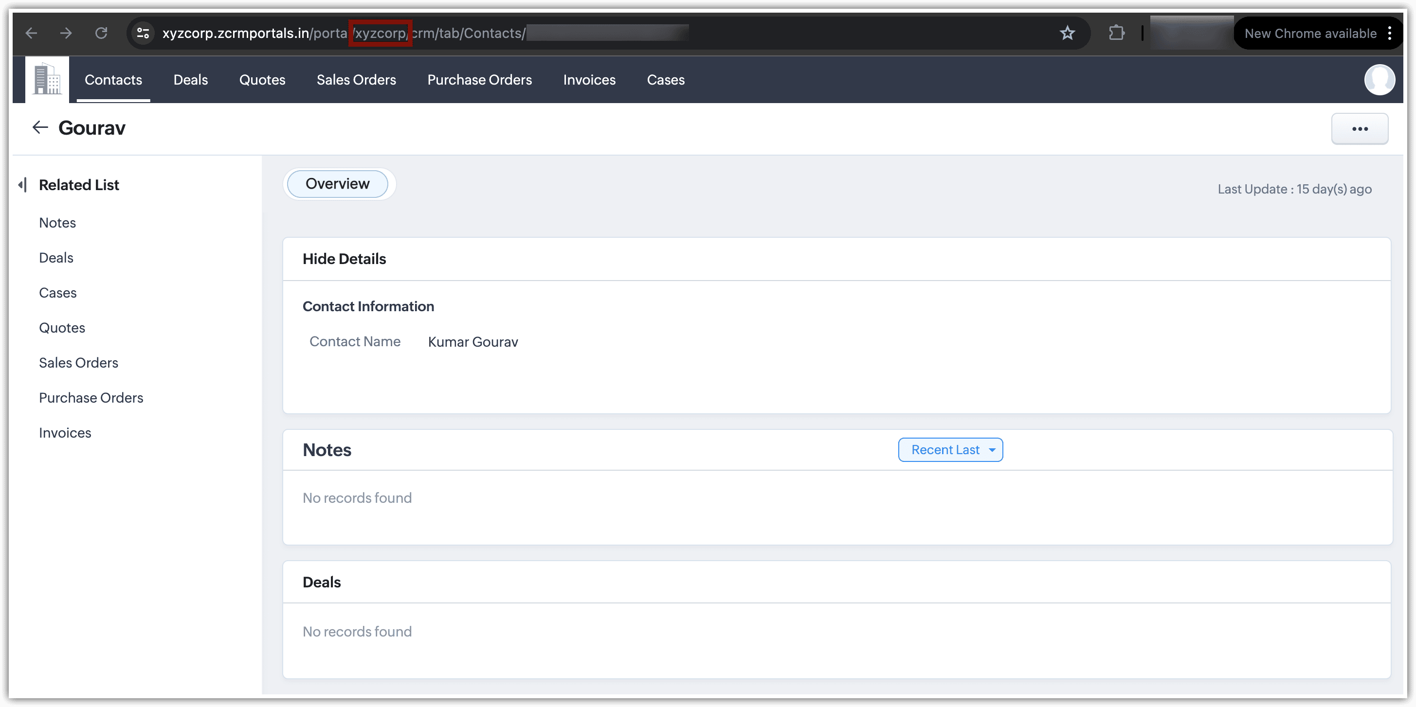 Con i portali in Zoho CRM, è possibile invitare utenti, come i contatti, a partecipare. Quando questi utenti ricevono un invito e accedono al portale, vedranno un URL con una serie di numeri, ad esempio: xyzcorp/crm/tab/contacts/74764395. Il nome xyzcorp o il nome dell'organizzazione configurato durante la creazione dell'account CRM è l'ID del Portale univoco dell'utente. Questo ID è comune per tutti gli utenti di quel portale specifico.