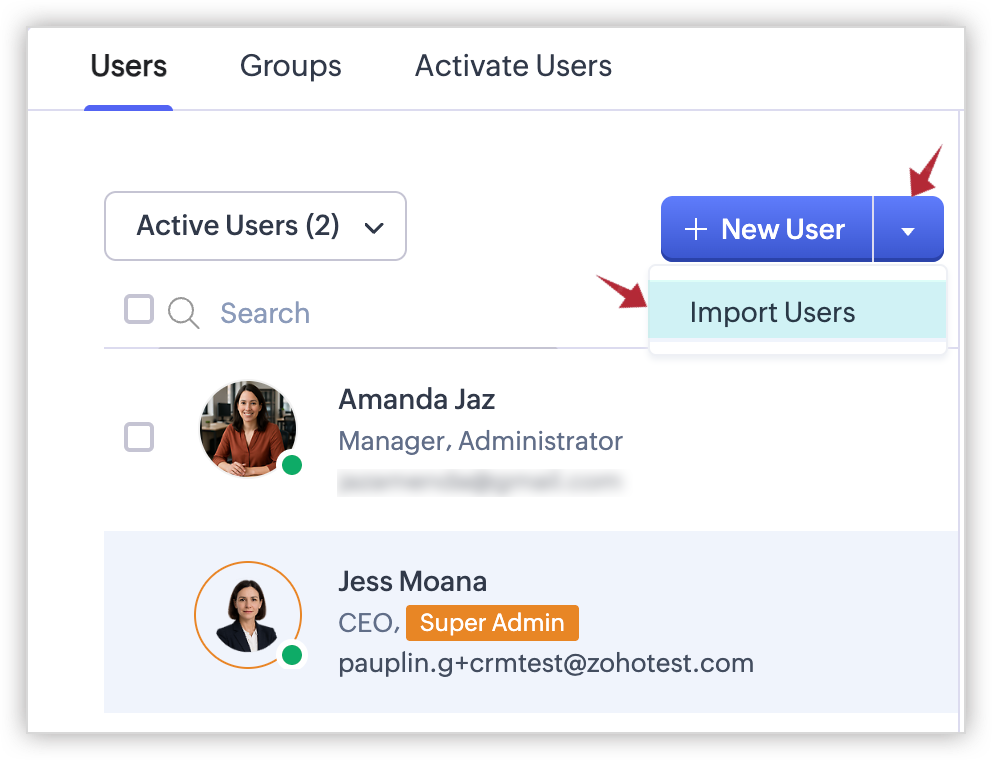 - Nella scheda Users, fare clic sul menu accanto al pulsante +New User e scegliere l'opzione Import Users