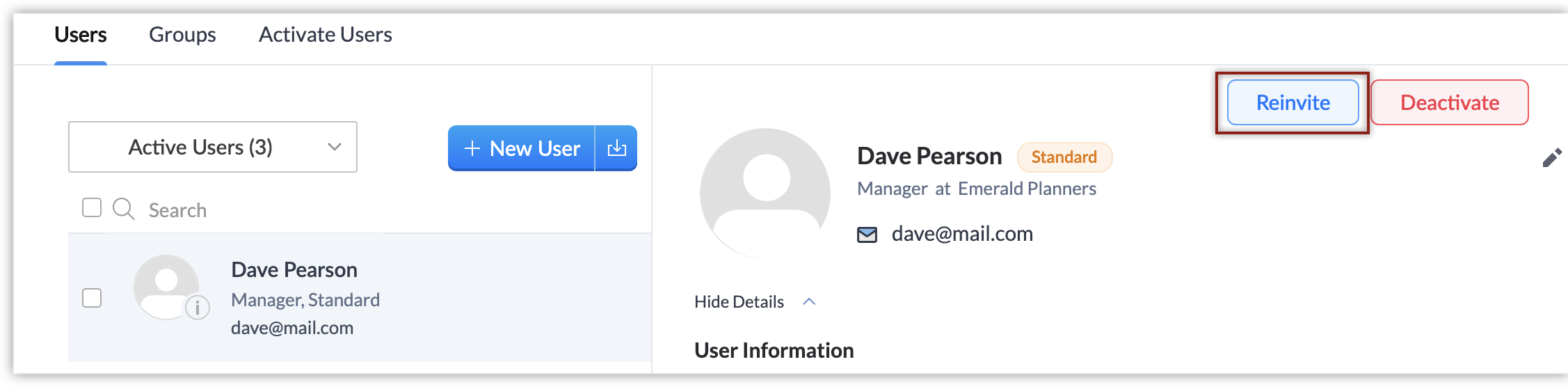 - Nella pagina Users , selezionare l'utente desiderato. Nella sezione Dettagli utente fare clic su Reinvita.
