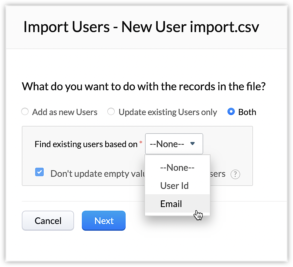 - Gli utenti esistenti possono essere aggiornati in base allo User ID o all'indirizzo Email.