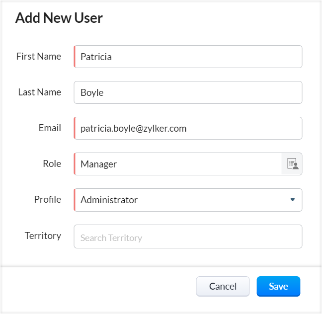 È possibile aggiungere altri dettagli come numeri di telefono, indirizzo, foto, fax, sito web, data di nascita, lingua, ecc., dopo aver aggiunto l'utente. - Territory : Assegnare un territorio all'utente.