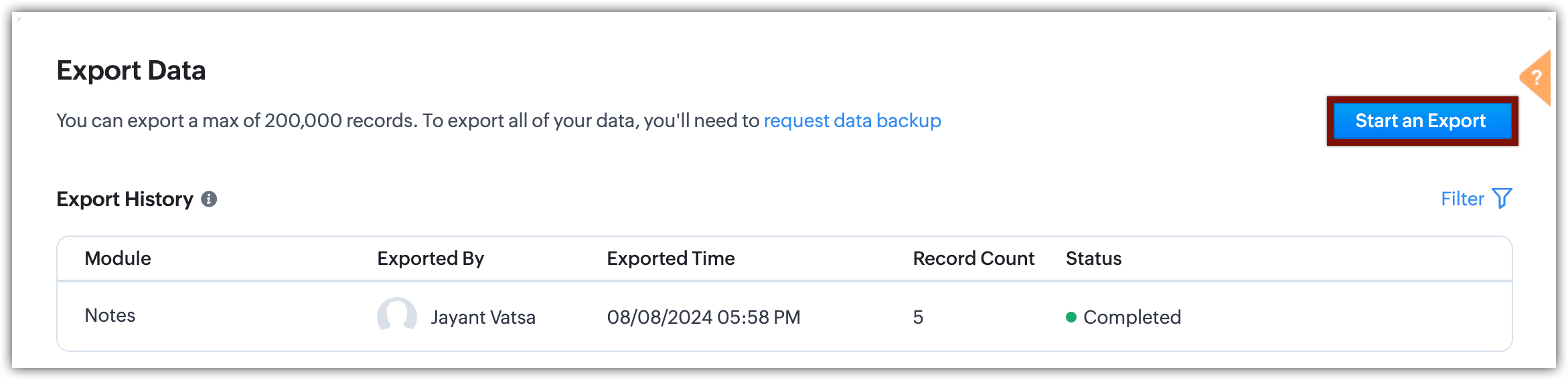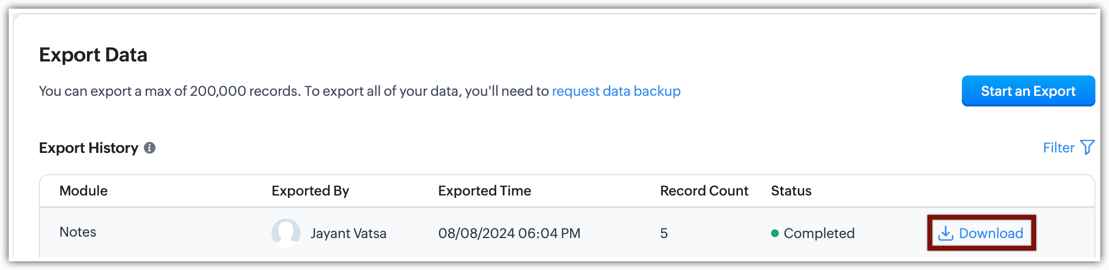 - Nella pagina Export Data, fare clic su Start an Export.