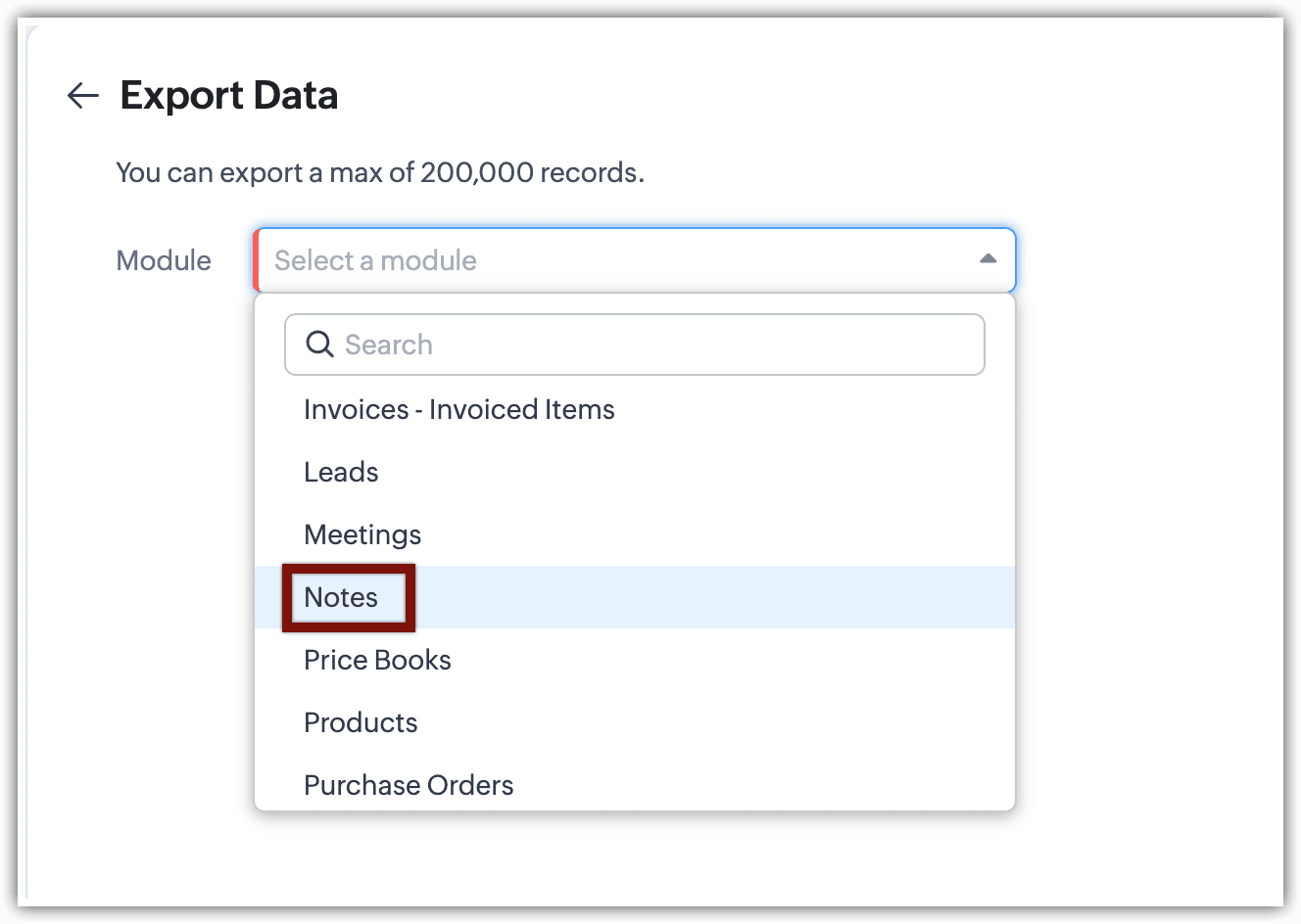 - Successivamente, verrà richiesto di selezionare il modulo principale dall'elenco a discesa, ovvero il modulo primario da cui si desidera esportare tutte le note.