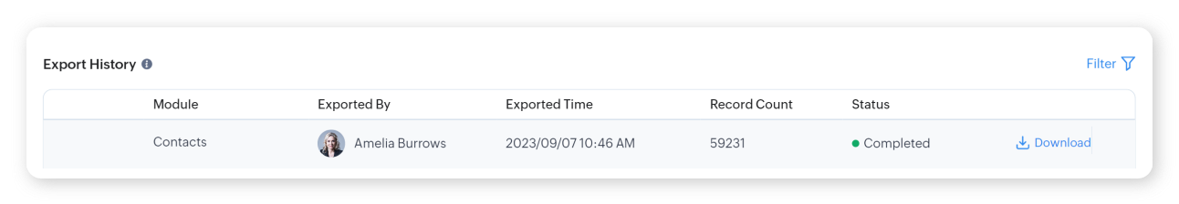 - Minimizzazione dei dati: Esportare solo i dati necessari. Zoho CRM consente opzioni avanzate di filtraggio e selezione dei dati in modo da poter esportare solo i record e i campi specifici richiesti. Questo riduce al minimo il rischio di esporre inutilmente informazioni sensibili.