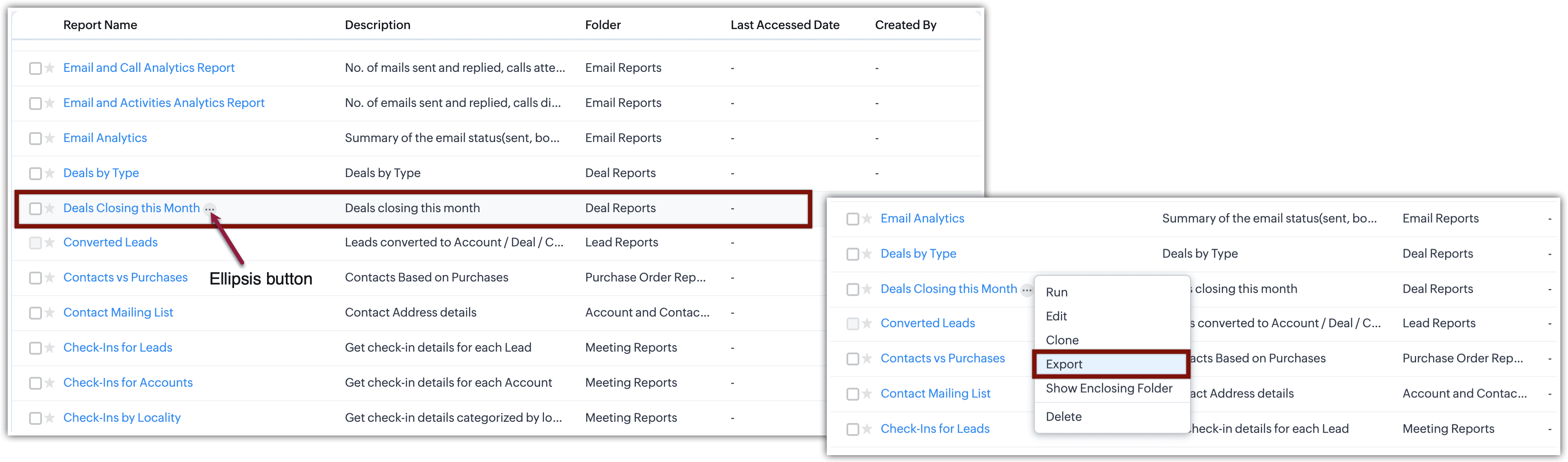 - Per esportare un report, passare il mouse sul report desiderato, fare clic sul pulsante con i tre puntini (...) che appare e selezionare Export dal menu.