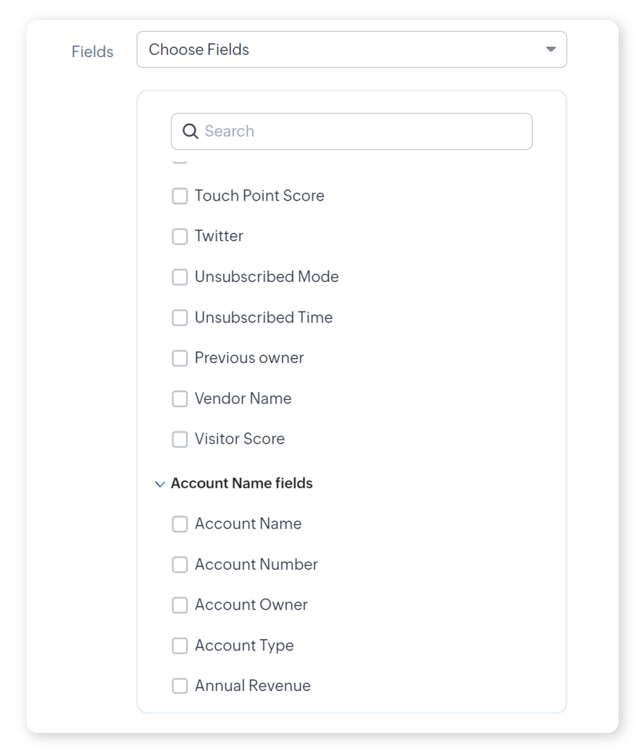 Se è stato selezionato Choose fields, è possibile scegliere i campi dal modulo e dai moduli di ricerca correlati.