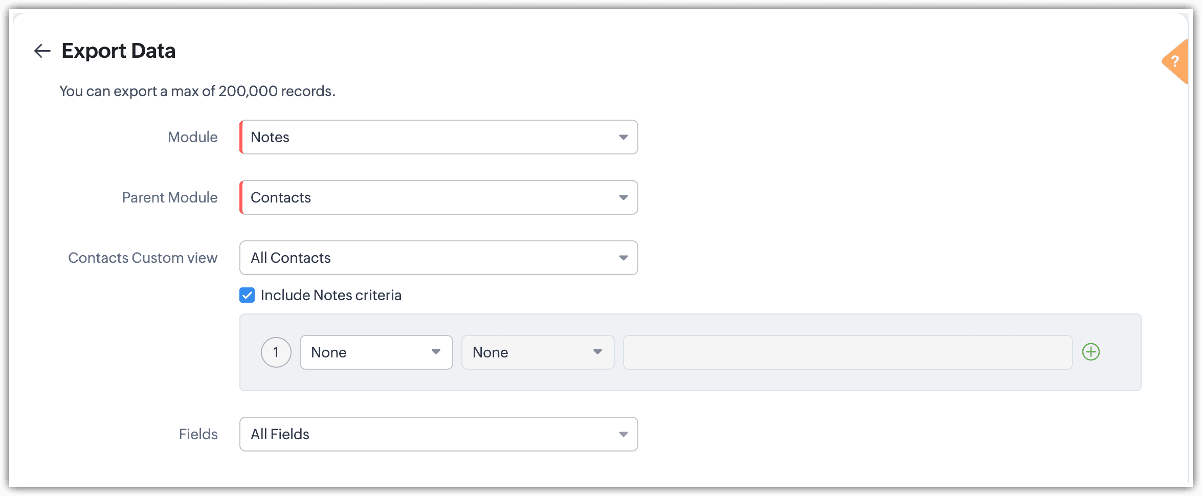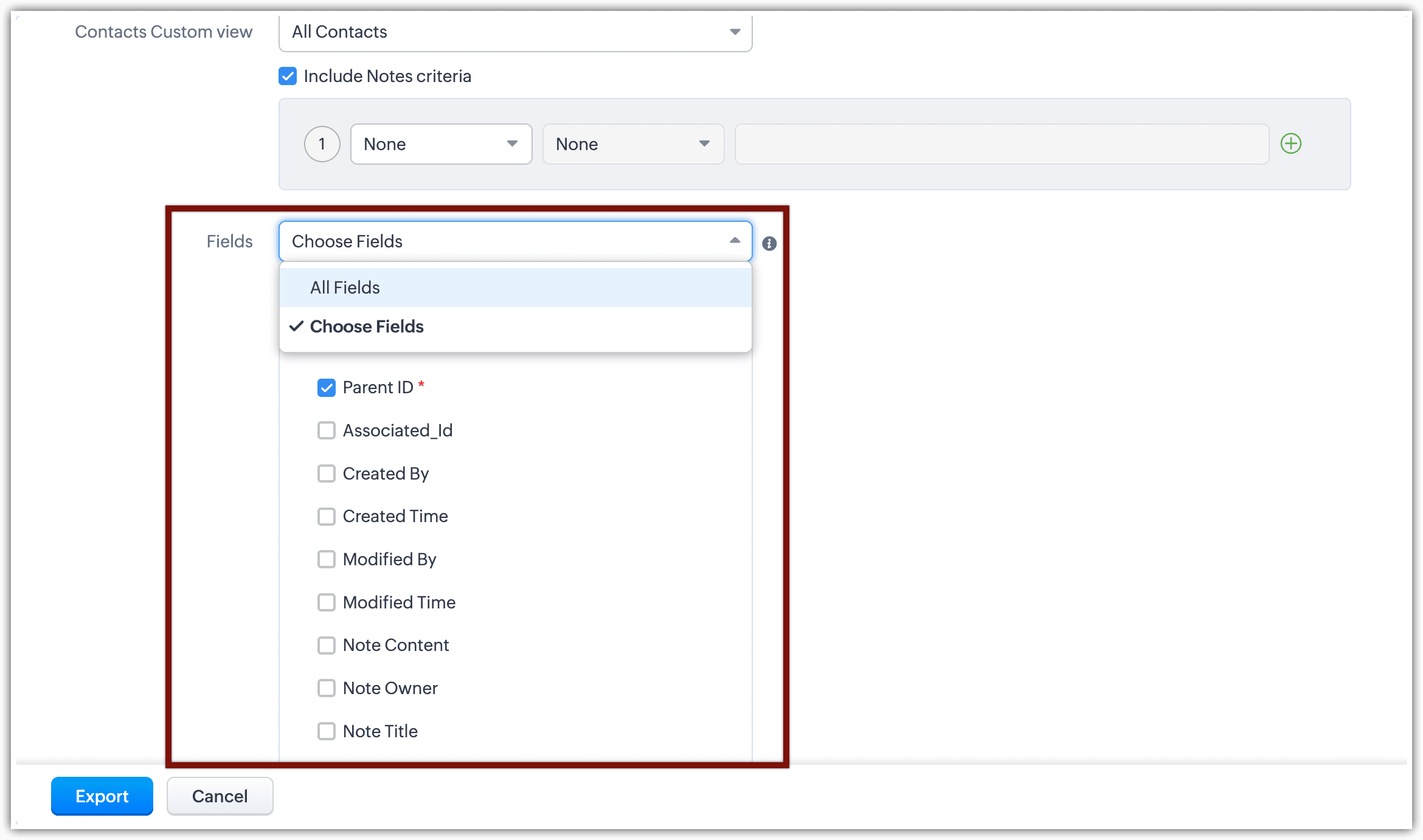 - Successivamente, è possibile selezionare dalle viste personalizzate del modulo principale, come All Contacts o My Contacts (se il modulo Contacts è il modulo principale). Inoltre, è possibile filtrare le note in base a criteri specifici abilitando l'opzione Include Notes Criteria.