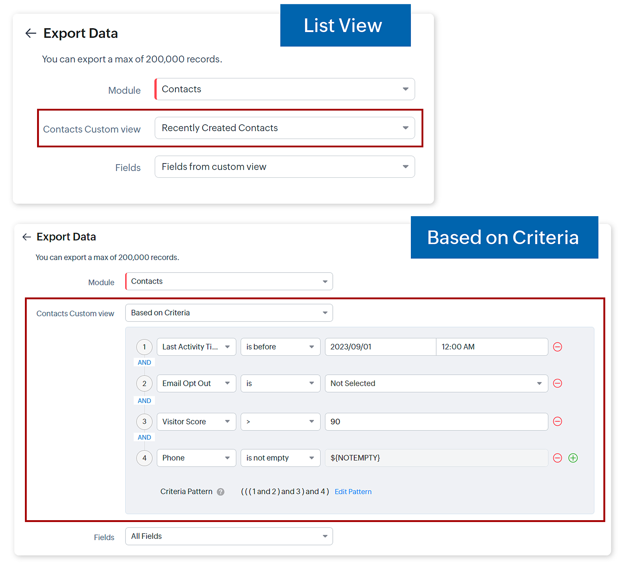 Sì. Quando si crea un'esportazione, è possibile scegliere di esportare una vista personalizzata o impostare i criteri per l'esportazione. È inoltre possibile selezionare i campi da includere nell'esportazione. Vedere anche>> Esportare i dati del CRM.