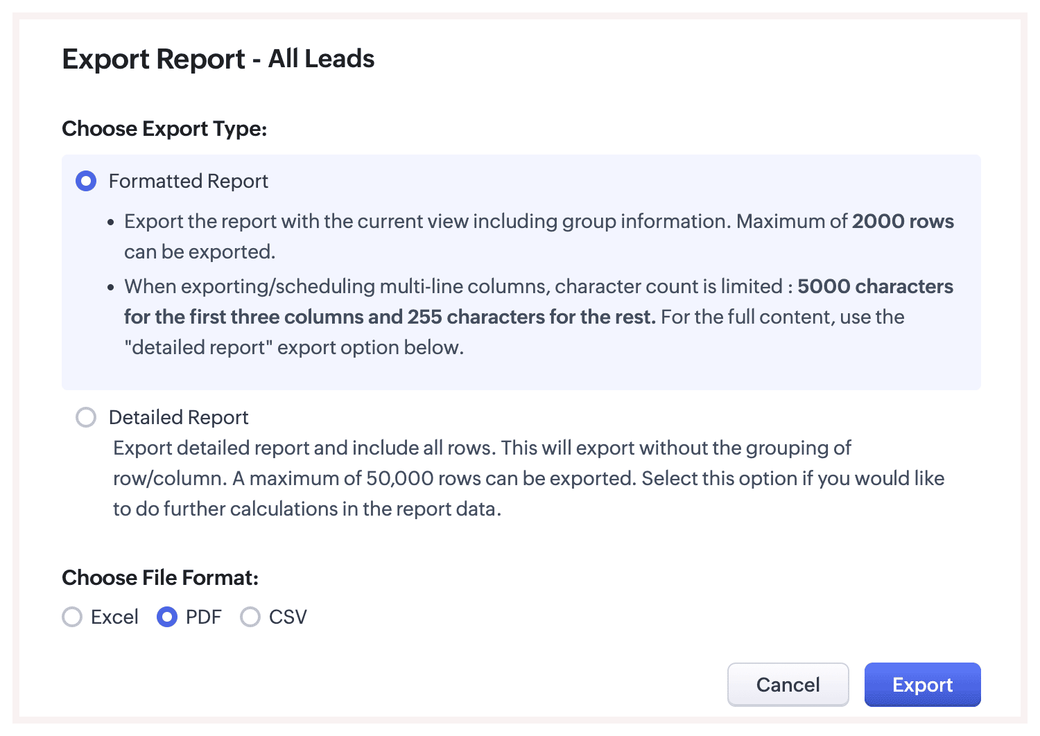 In Zoho CRM è possibile esportare report formattati nei formati Excel, CSV e PDF. Per le esportazioni di report dettagliati, sono disponibili solo i formati Excel e CSV. Ogni formato di esportazione ha restrizioni specifiche relative al volume di dati esportabili.