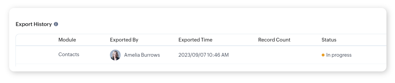 L'esportazione verrà aggiunta alla tabella Export History con lo stato In progress.