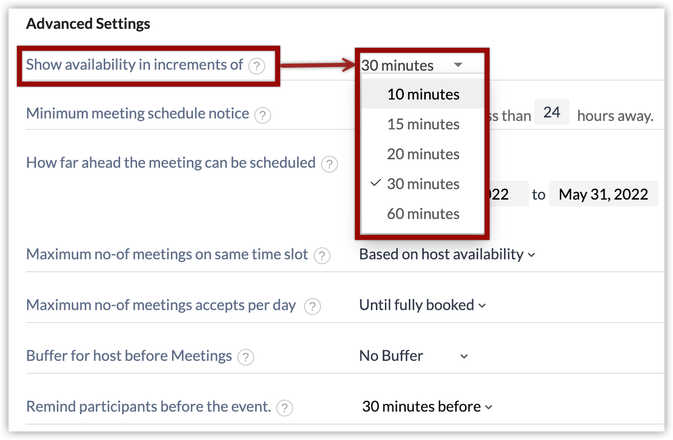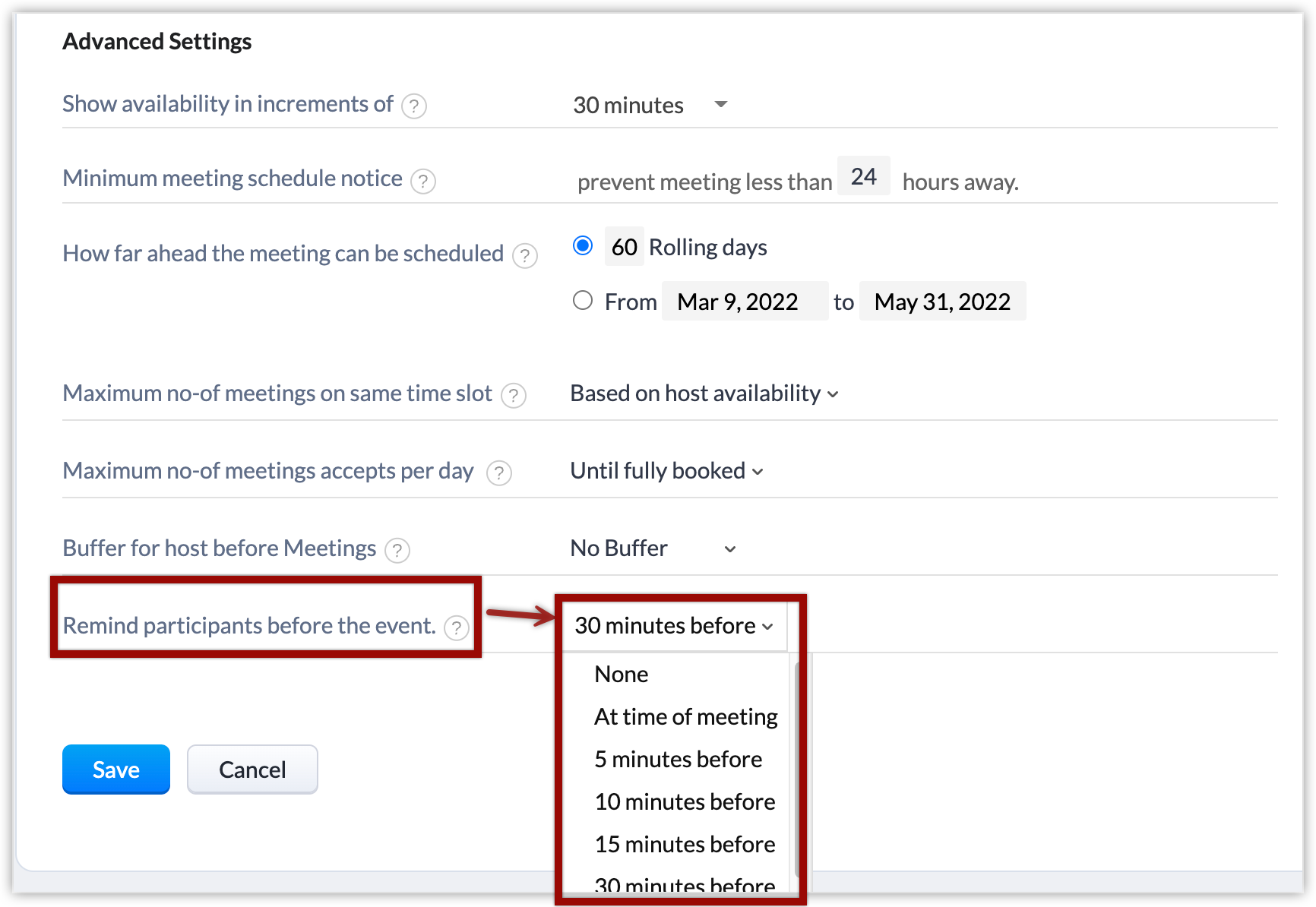 Nella pagina di prenotazione, scorra fino in fondo. In Advanced Settings, troverà un'opzione per Remind participants before the event. Faccia clic sul menu a discesa e scelga quanto tempo prima della riunione desidera che gli utenti vengano avvisati, oppure può semplicemente aggiungere un valore personalizzato.