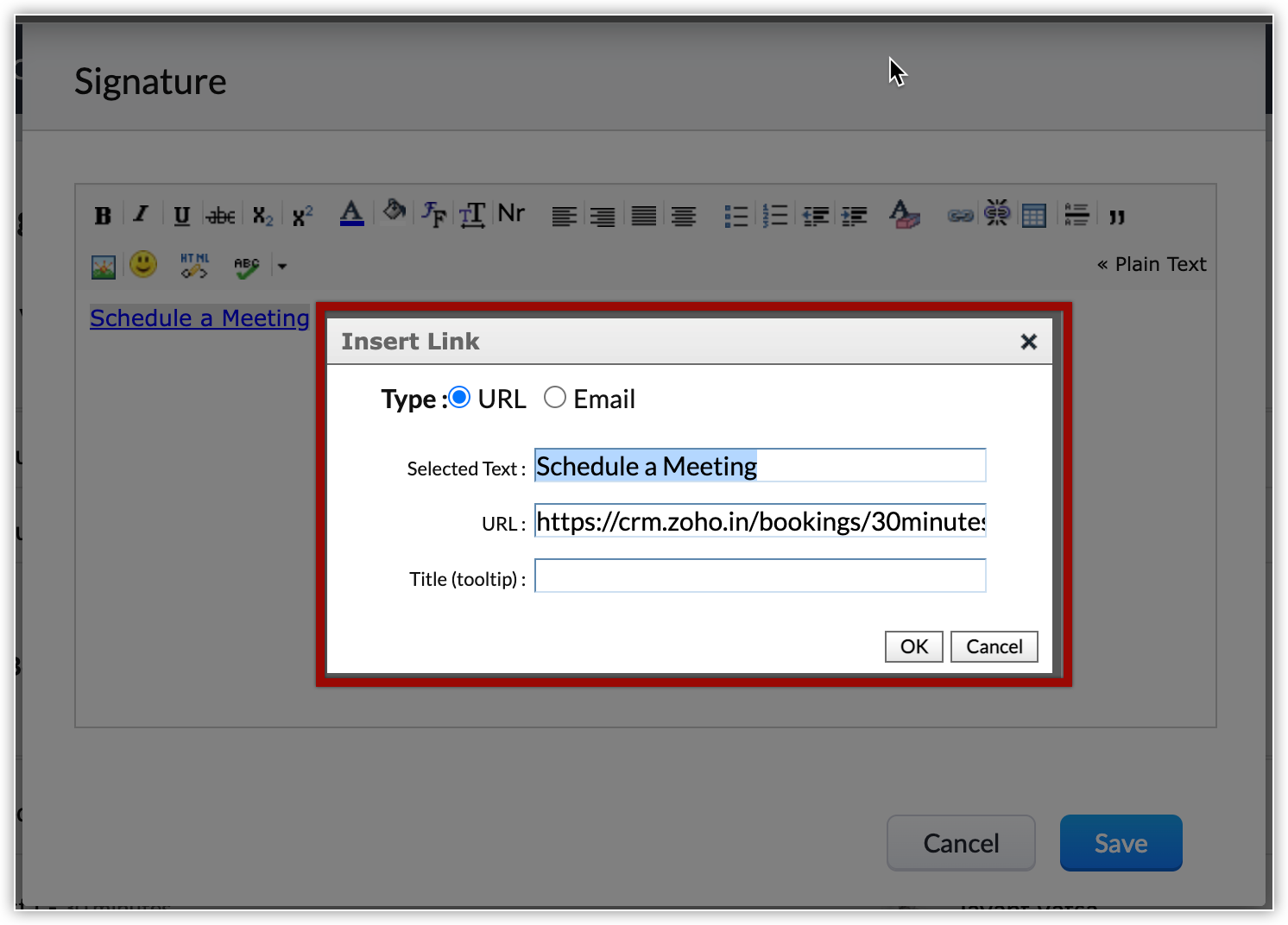 Può aggiungere il link come firma e-mail. Per farlo, vada alla finestra Manage Calendar Booking e quindi faccia clic su More > Add to email signature per la prenotazione che desidera condividere. Verrà reindirizzato alla pagina Insert Link , dove dovrà aggiungere il testo nella casella Selected Text . L'URL della prenotazione verrà compilato automaticamente. Inserisca il Title e faccia clic su OK .