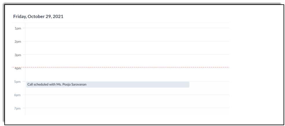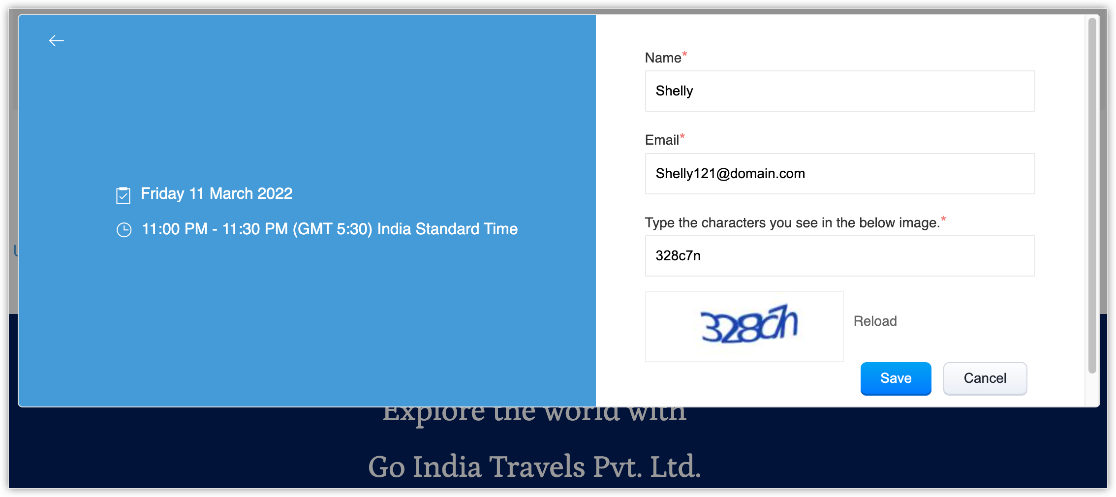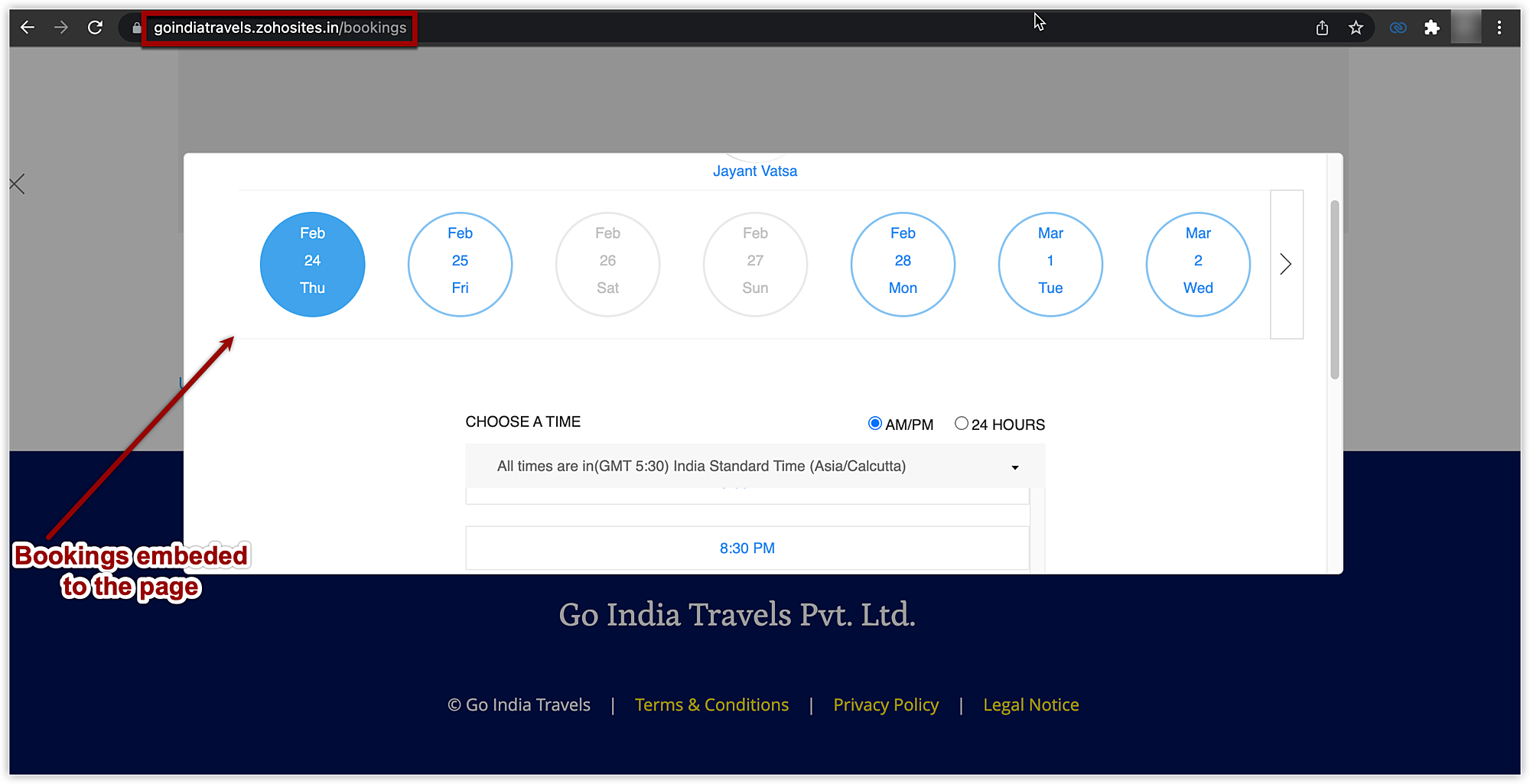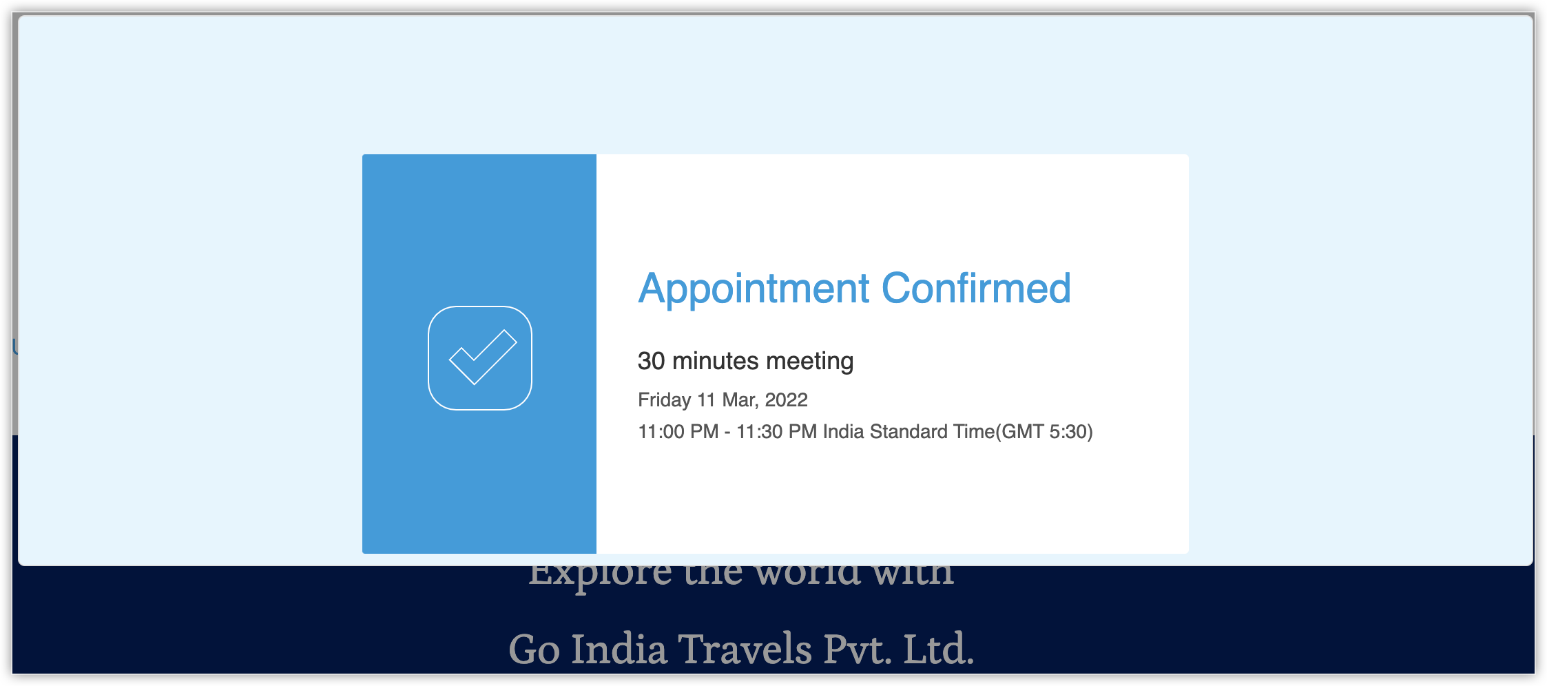 Supponiamo che una studentessa desideri fare un viaggio educativo per il suo progetto in corso. Per informarsi sul viaggio, visita la pagina web di un'azienda di viaggi e ospitalità chiamata Go India Travel, che utilizza Zoho CRM e ha incorporato questa funzione di prenotazione calendario nel proprio sito web. Utilizzando quel pulsante incorporato, la studentessa può semplicemente fissare un appuntamento all'orario da lei preferito.