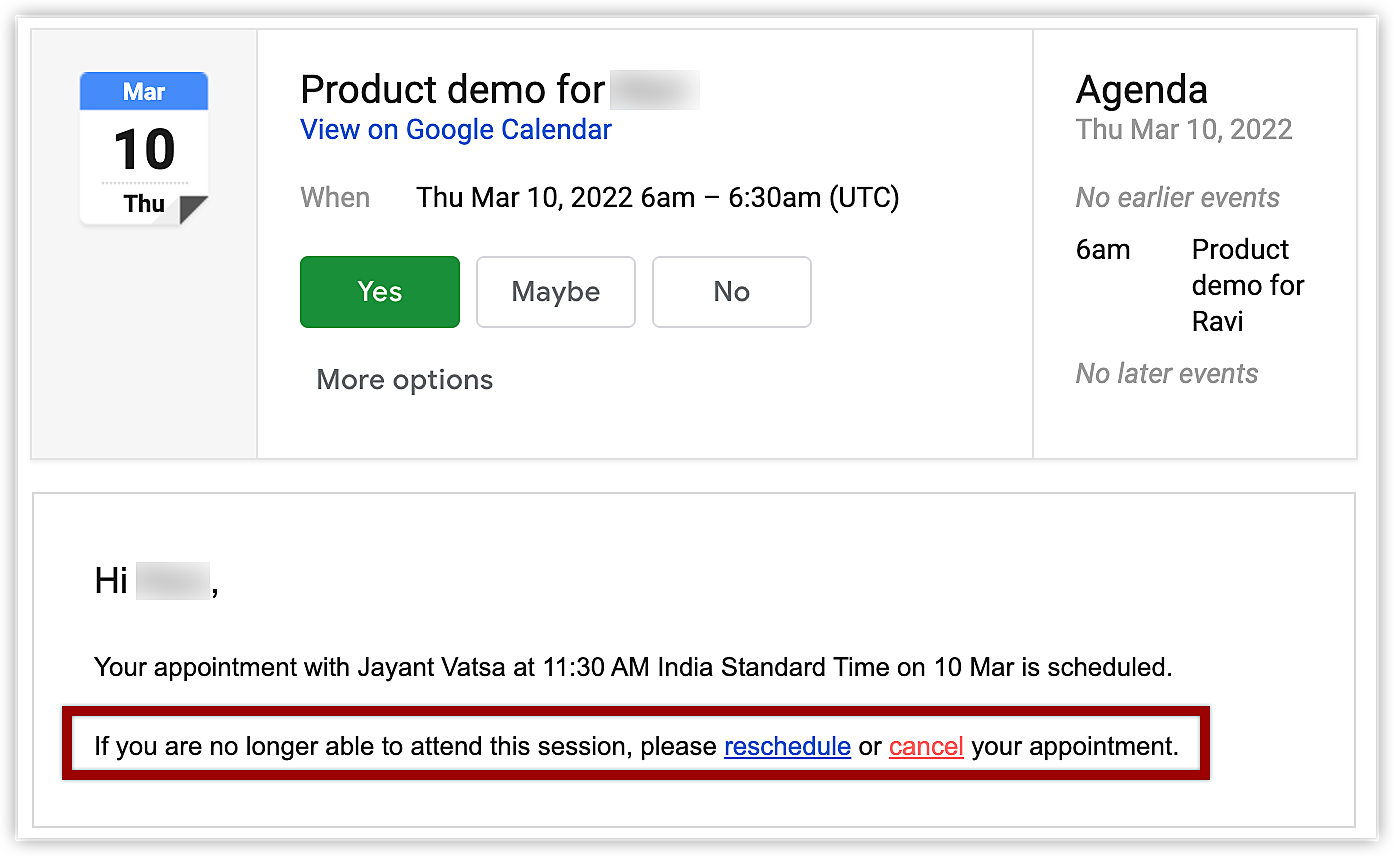 Sia il cliente che l'ospitante riceveranno un'e-mail di conferma della riunione pianificata. Possono riprogrammare o annullare la riunione anche da questa e-mail.