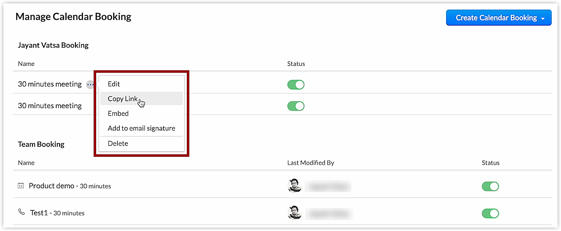 Può anche semplicemente copiare il link e condividerlo tramite SMS, e-mail, piattaforme di social media, WhatsApp e così via. Nella finestra Manage Calendar Booking , faccia clic su More per la prenotazione che desidera condividere. Faccia clic su Copy Link per aggiungerlo agli appunti, e poi lo incolli dove desidera condividerlo.