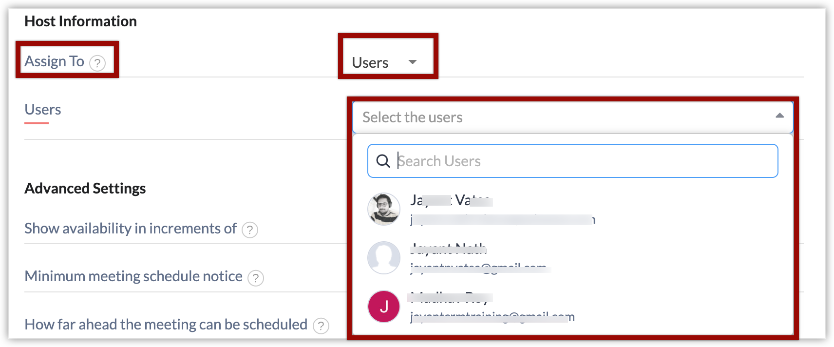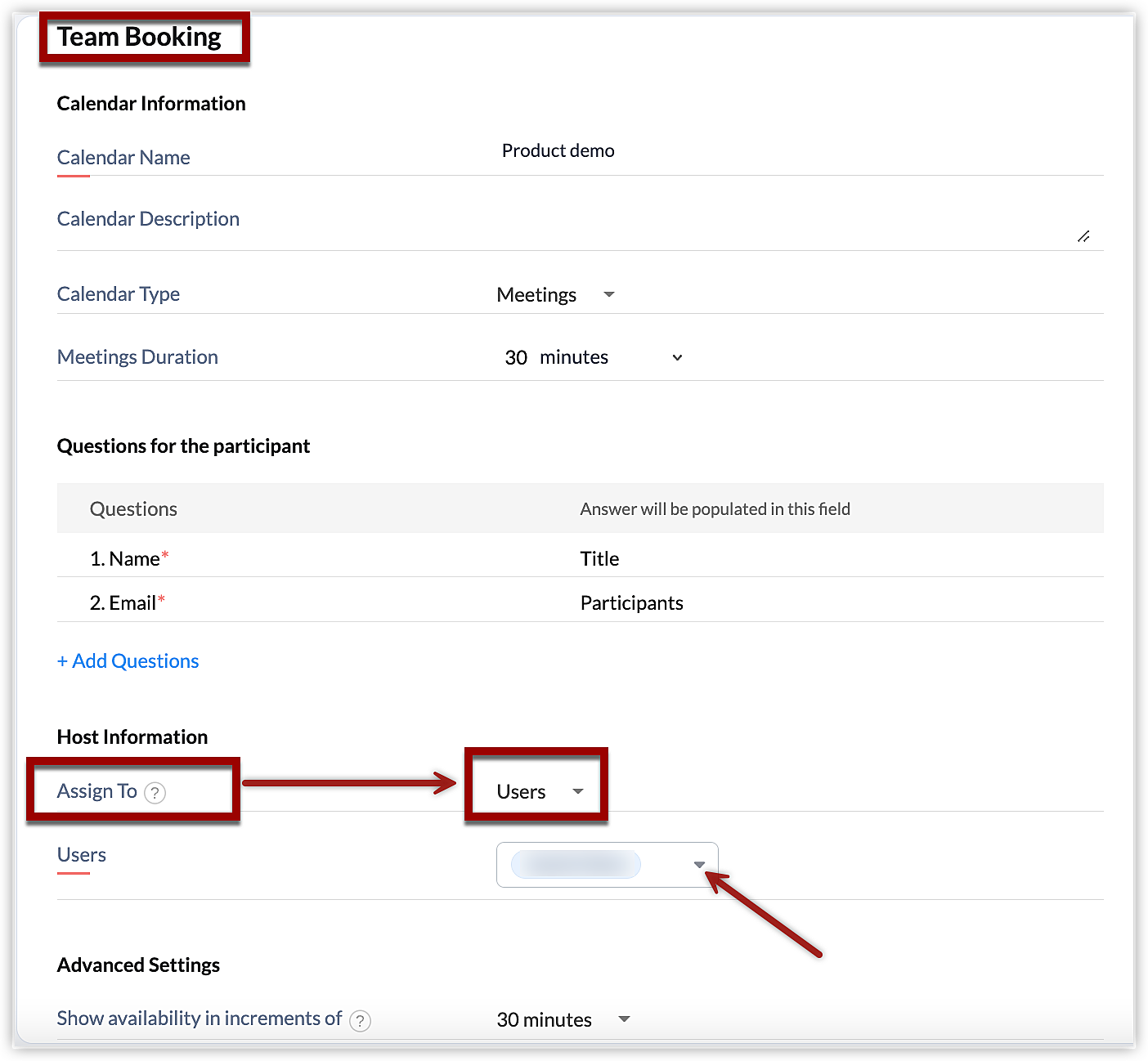 Se desidera che le prenotazioni vengano assegnate a più utenti nella Sua organizzazione, vada alla Manage Calendar Booking pagina e nella sezione Team Bookings , sotto Host Information, faccia clic sul menu a discesa Assign to per scegliere tra Users/Groups/Territory .