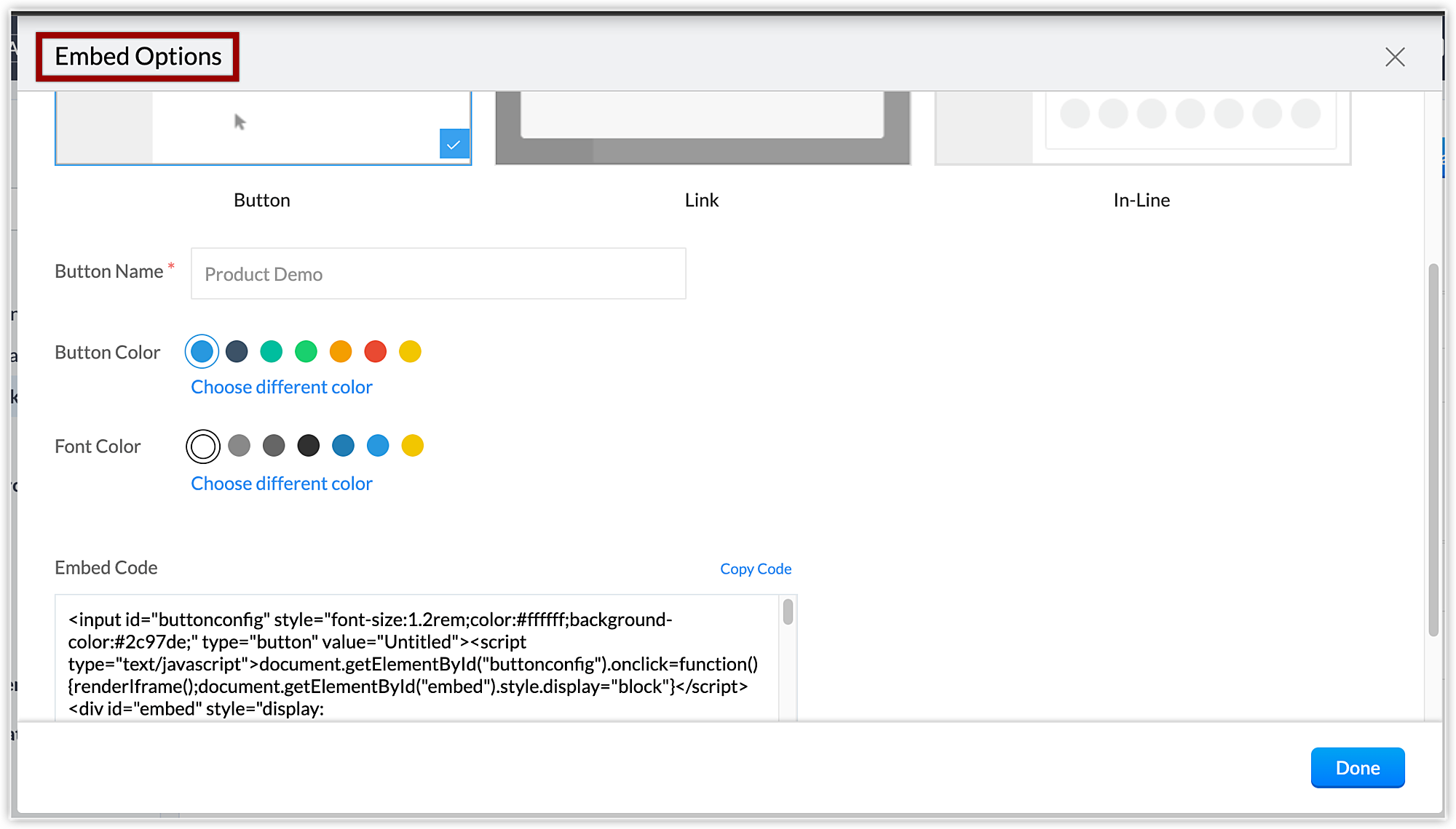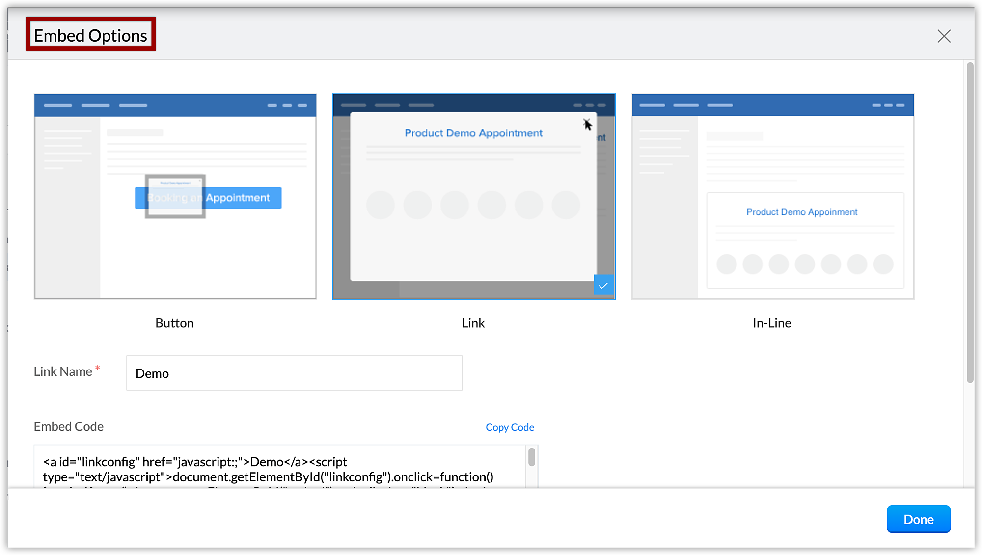 Per incorporarlo, nella finestra Manage Calendar Booking , faccia clic su More > Embed per la prenotazione che desidera condividere. Dal popup Embed Options , scelga tra le tre opzioni e inserisca il Name per button e link . Quindi selezioni i temi e i colori adatti al Suo sito web. Poi copi il codice visualizzato automaticamente e faccia clic su Done . Può incollare il codice nel codice sorgente HTML del Suo sito web.