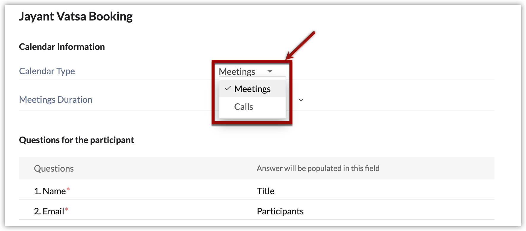 Ho creato una riunione di 30 minuti tramite la prenotazione calendario in Zoho CRM. Quando il mio cliente ha prenotato un appuntamento, è stata creata una nuova riunione nel CRM con l'oggetto "30-minute meeting". È possibile personalizzare il nome della prenotazione?