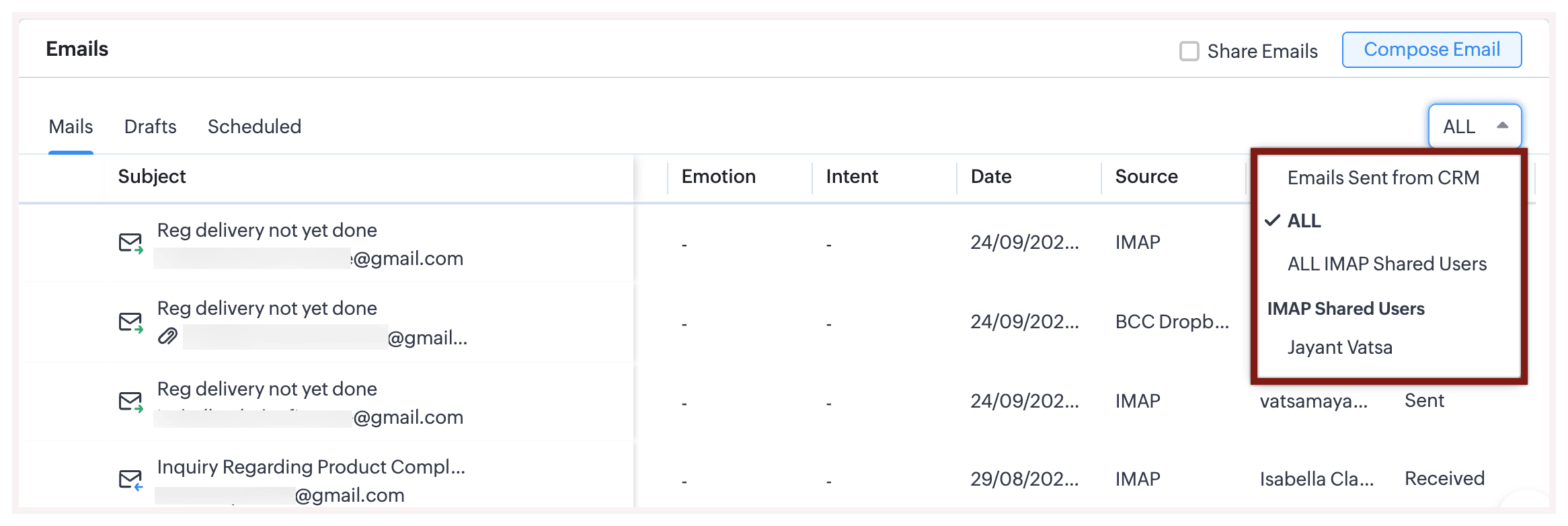 Si noti che il CRM monitorerà solo le email ricevute nella casella di posta integrata. Le email provenienti da altri indirizzi "from" verranno sincronizzate solo quando fanno parte della casella di posta configurata del proprio account. La funzionalità consente agli utenti solo di inviare email utilizzando quell'indirizzo.