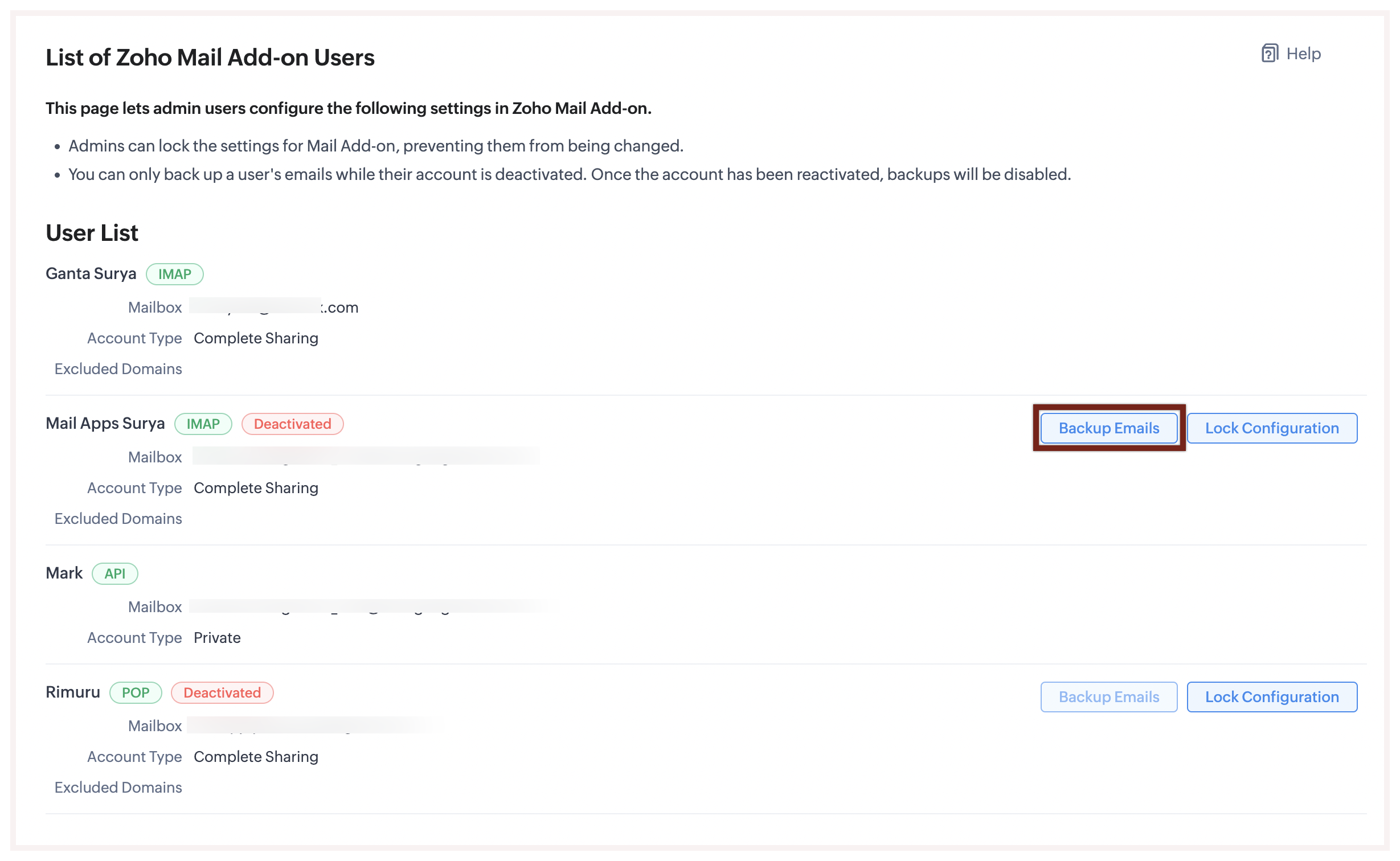 - Navigare su Setup > Security Control > Zoho Mail Add-on Users.