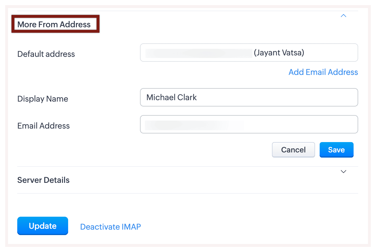 L'integrazione email nel CRM è generalmente specifica per account. Ciò significa che ogni utente in un account Zoho CRM deve configurare il proprio account email nel CRM. Esistono due modi per aggiungere ulteriori indirizzi mittente: