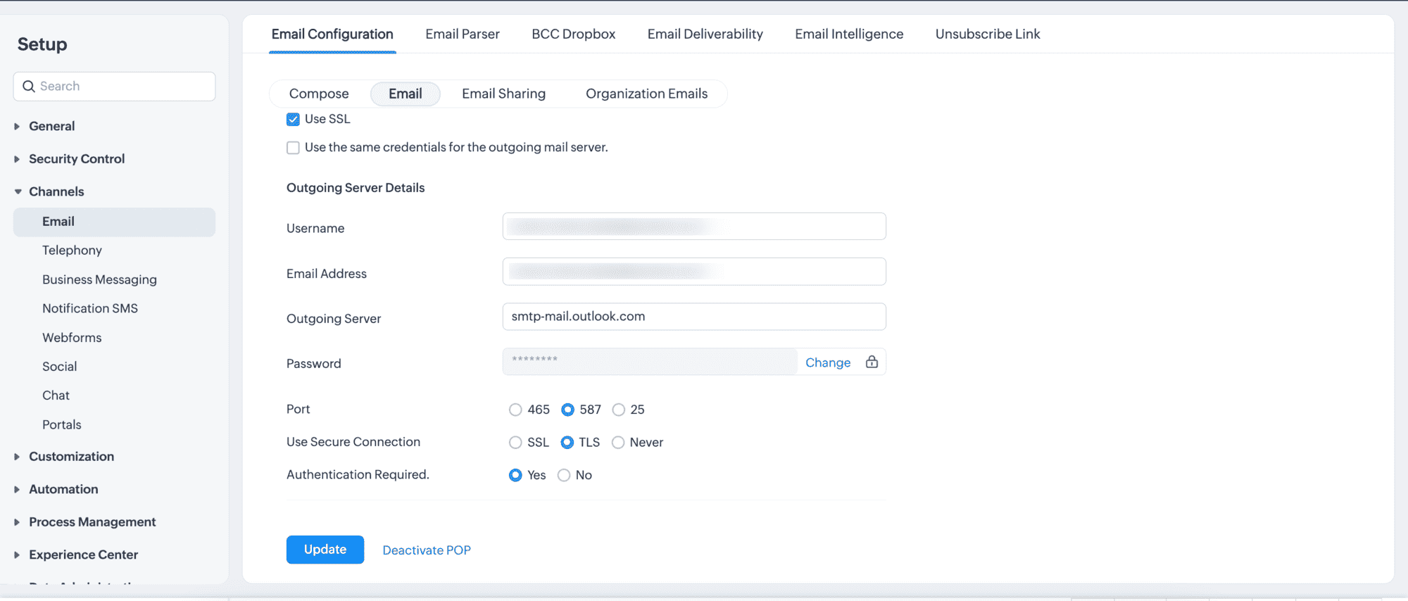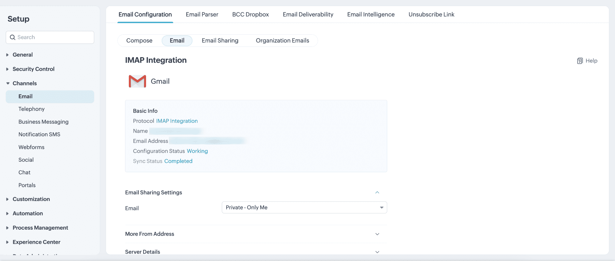 - In Zoho CRM, navigare su Setup > Channels > Email > Email Configuration > Email (Sub-section)