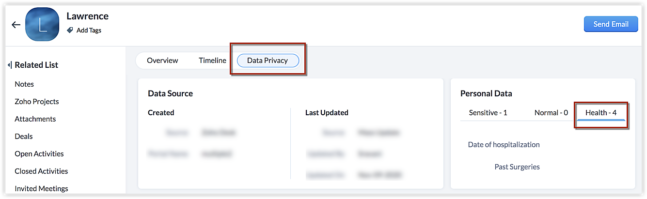 Tutti i campi contrassegnati come contenenti dati sanitari personali saranno elencati nella pagina dei dettagli del record. Sotto Data Privacy, nella sezione Personal Data, è possibile fare clic sulla scheda Health per visualizzare i campi che contengono dati sanitari personali.