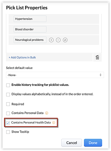 In un modulo, potrebbero esserci solo alcuni campi che contengono dettagli sanitari personali di un cliente. Ad esempio, anamnesi chirurgica, sintomi, dettagli sui farmaci, ecc. Contrassegnare questi campi come dettagli sanitari personali aiuterà il sistema a identificare e limitare l'accesso a questi campi tramite API e impedire l'esportazione dei valori di questi campi. È possibile contrassegnare un totale di 25 campi in ciascun modulo come campi contenenti dati sanitari personali.