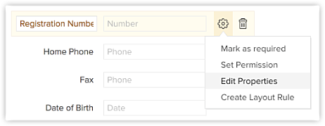 - Nell'editor del layout del modulo, andare al campo che si desidera crittografare, fare clic sull'icona Settings e selezionare Edit Properties.