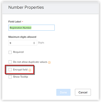 I campi crittografati vengono aggiunti con Encryption at Rest (EAR). Per saperne di più sulla crittografia consultare il whitepaper sulla crittografia di Zoho.