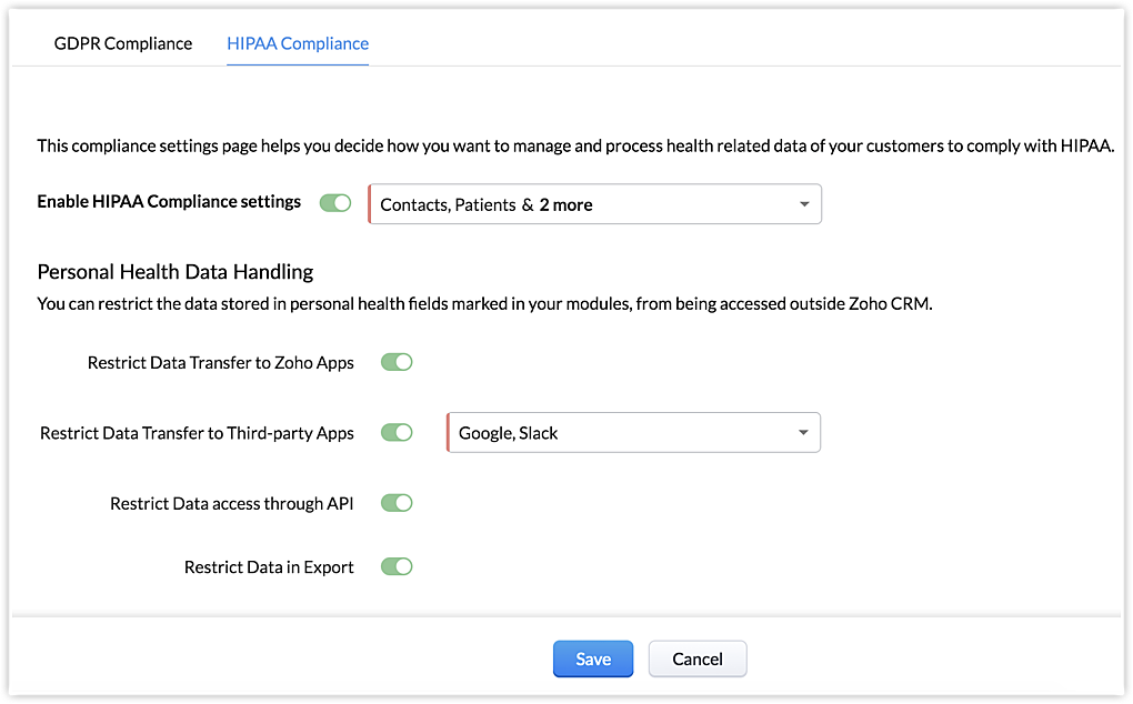 In Zoho CRM, consentiamo alle organizzazioni di essere conformi alle linee guida HIPAA fornendo le seguenti opzioni: