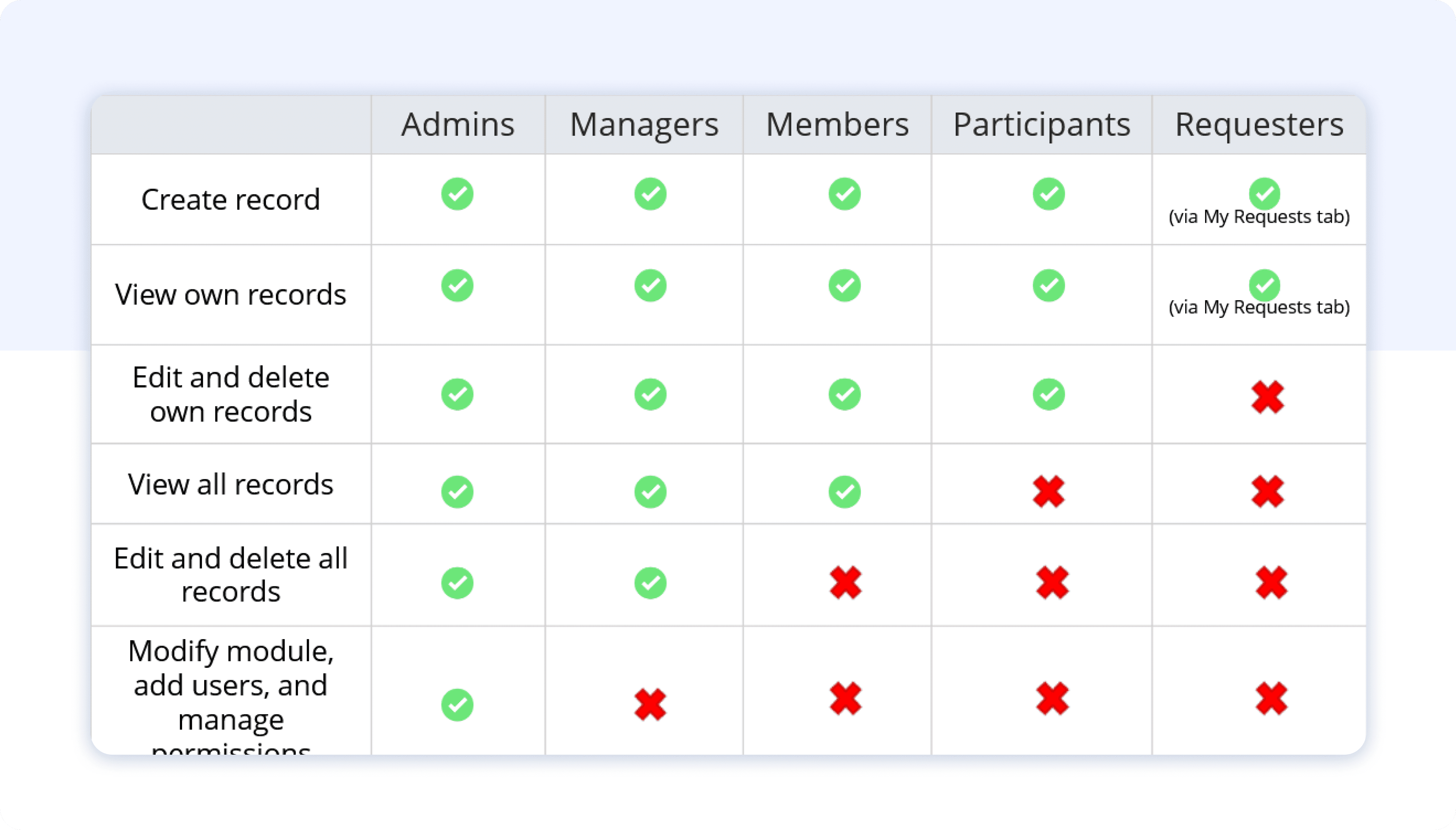 - Membri e Partecipanti hanno diversi livelli di accesso ai record, con i membri che possono visualizzare tutti i record e i partecipanti che possono visualizzare solo i propri. Entrambi potranno creare, modificare ed eliminare i propri record.