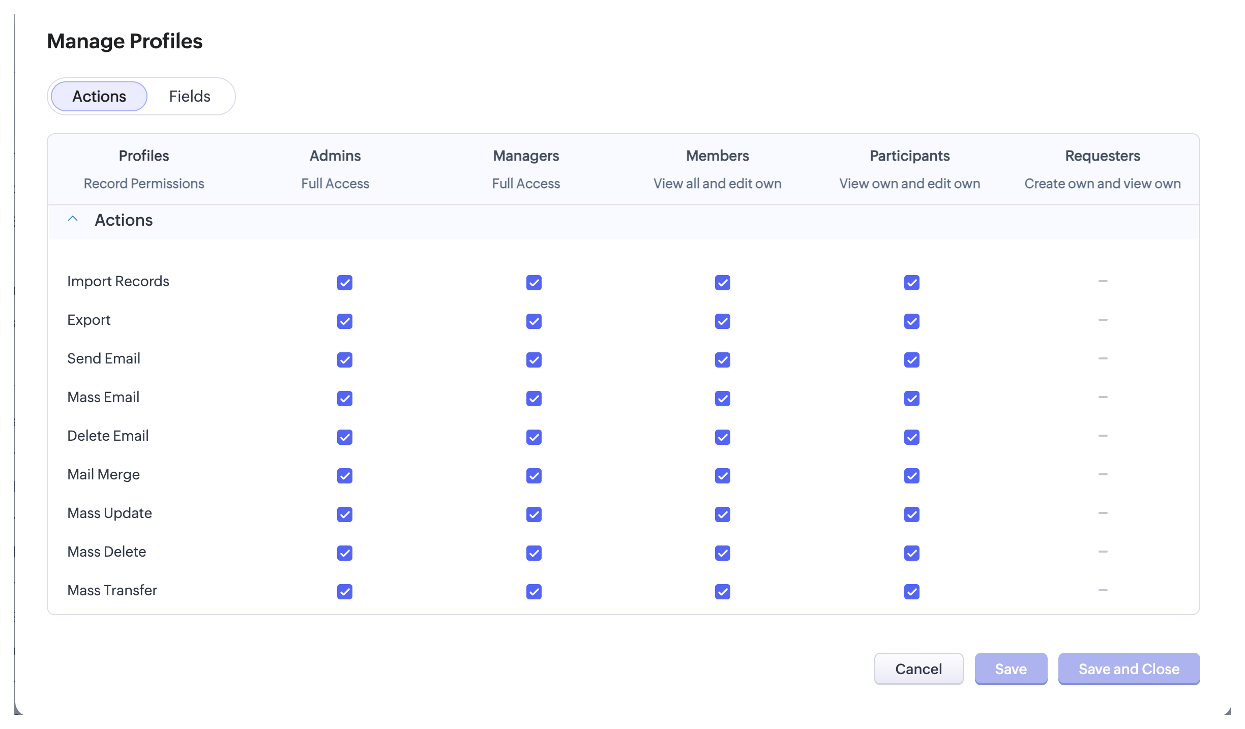 Gli amministratori del modulo team possono personalizzare le autorizzazioni per campi e azioni su base per-profilo.