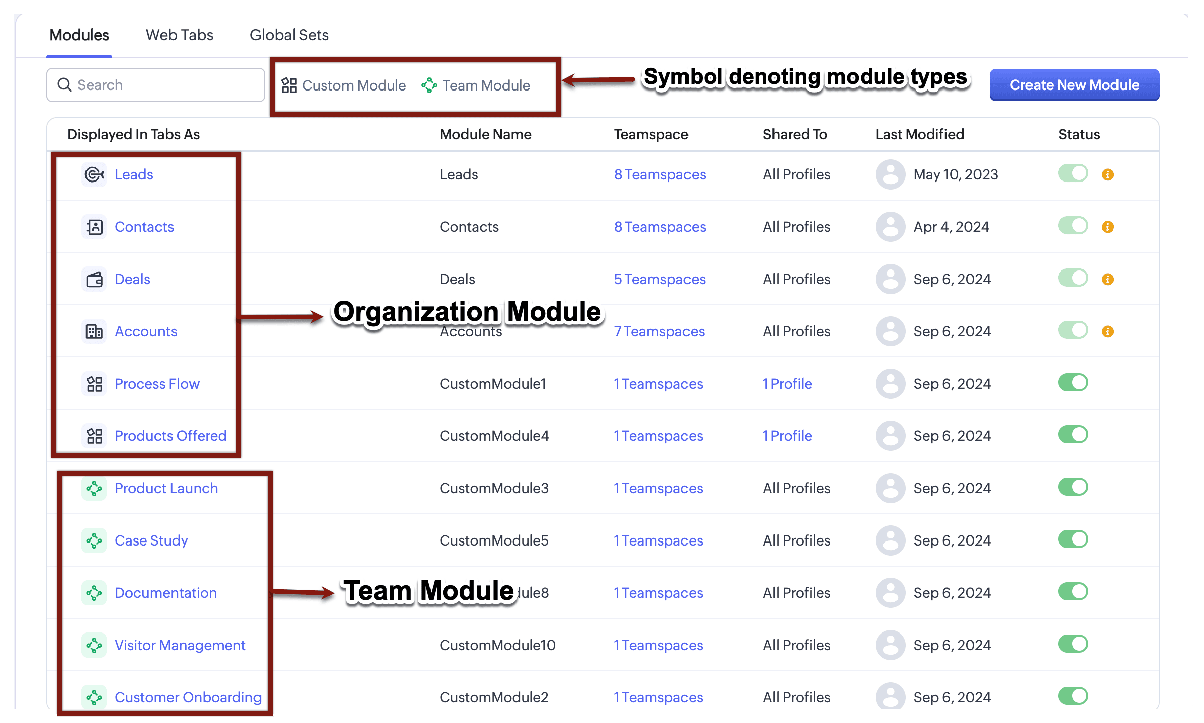- Modulo Team: A differenza dei moduli a livello di organizzazione, i moduli team sono progettati per Teamspace specifici e non sono universalmente accessibili. Non è possibile renderli disponibili per tutti. Si tratta essenzialmente di moduli personalizzati ma adattati per singoli team o reparti all'interno del CRM. I moduli team consentono ai team di gestire i propri flussi di lavoro specifici e favorire la collaborazione all'interno del loro Teamspace. Gli utenti possono creare e personalizzare i propri moduli Team con le autorizzazioni appropriate, rendendoli unici per il loro teamspace. Attualmente non esiste una configurazione organizzativa predefinita per i moduli team. Qualsiasi modulo team creato è esclusivamente un modulo personalizzato.