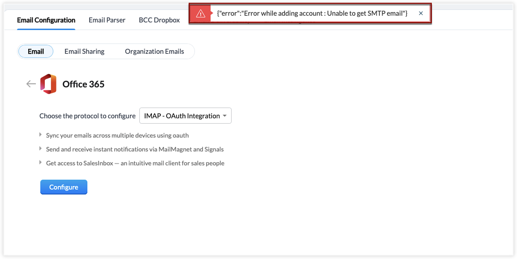 Durante l'integrazione di MS Outlook o Office 365 tramite protocolli IMAP-OAUTH o POP3-OAUTH, se riscontra i seguenti errori, segua i rispettivi passaggi per risolverli.