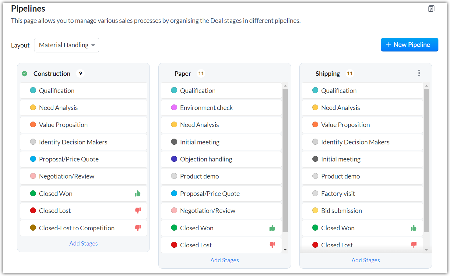 Se la Sua azienda opera in più settori, come edilizia, produzione di carta, spedizioni e viaggi, avrà bisogno di layout per trattative diversi e pipeline di vendita differenti.