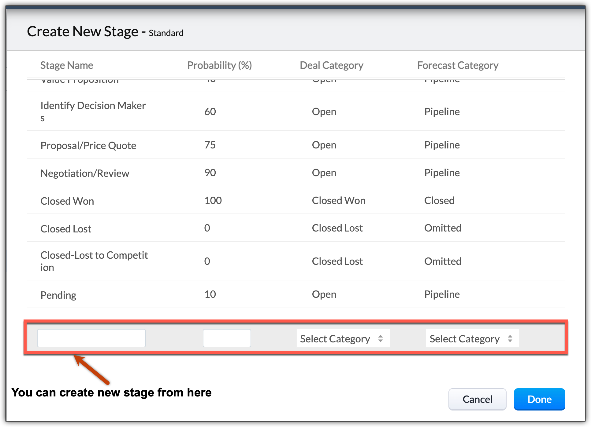 Una pipeline standard viene creata automaticamente da Zoho CRM quando l'utente tenta di creare una nuova pipeline. Questa pipeline sarà composta dalle fasi della trattativa esistenti. È possibile rinominare o personalizzare le fasi aggiungendo o eliminando campi fase nella pipeline.