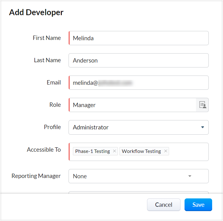 - Nel popup Add Developer , inserire i seguenti dettagli: