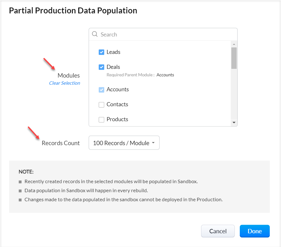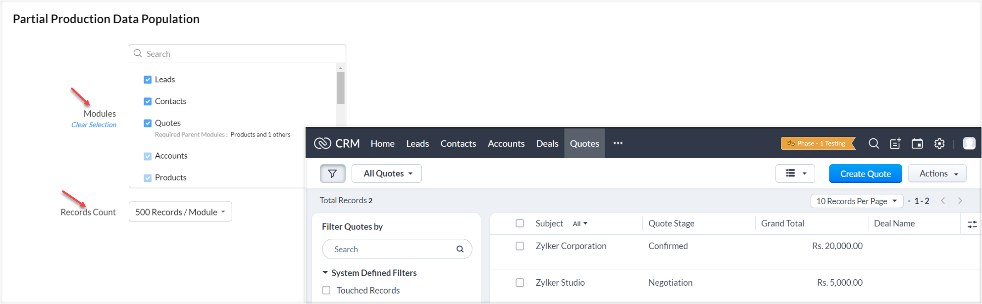 Se si desidera vedere le modifiche esatte che verranno applicate ai record CRM, è possibile popolare parte dei dati CRM nell'ambiente Sandbox. È possibile scegliere il numero di record da popolare in ciascun modulo. È inoltre possibile scegliere i moduli specifici che devono essere popolati con i dati nell'account sandbox.