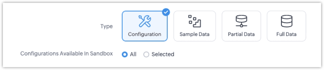 Partial Data | Testare con dati e configurazioni parziali di produzione. | Gli utenti possono selezionare moduli o record dalla produzione per i test, mantenendo al sicuro i dati sensibili e risparmiando spazio di archiviazione. |