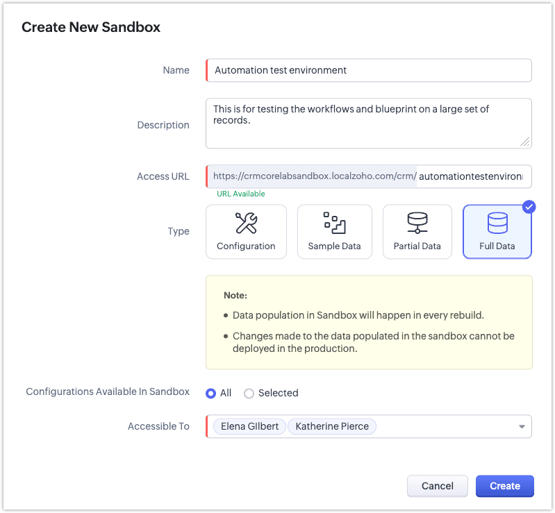 Se si desidera testare le configurazioni in un ambiente che corrisponde esattamente al proprio account live, è possibile scegliere il popolamento completo dei dati. Questo crea una replica completa dell'account di produzione, inclusi tutti i moduli standard e personalizzati con i relativi record. Consente di eseguire test approfonditi utilizzando dati in tempo reale prima della distribuzione.