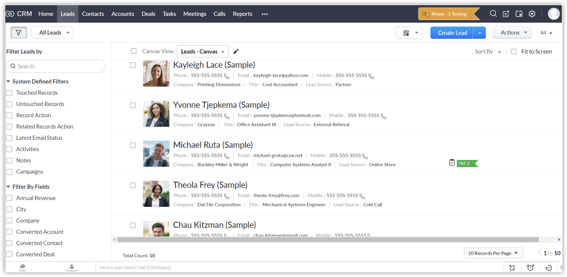 Se si desidera risparmiare il tempo necessario per creare manualmente i record o importarli nell'account sandbox, oppure se non si vuole che gli sviluppatori o gli utenti visualizzino i record CRM, è possibile popolare dati di esempio per i test. Scegliendo questa opzione, verranno popolati 10 record di esempio ciascuno per i moduli Lead, Account, Contatti, Trattative, Attività, Chiamate, Riunioni e Note. È possibile accedere ai record nei rispettivi moduli e apportare le modifiche necessarie. Durante la distribuzione, questi record non verranno popolati nell'account CRM.