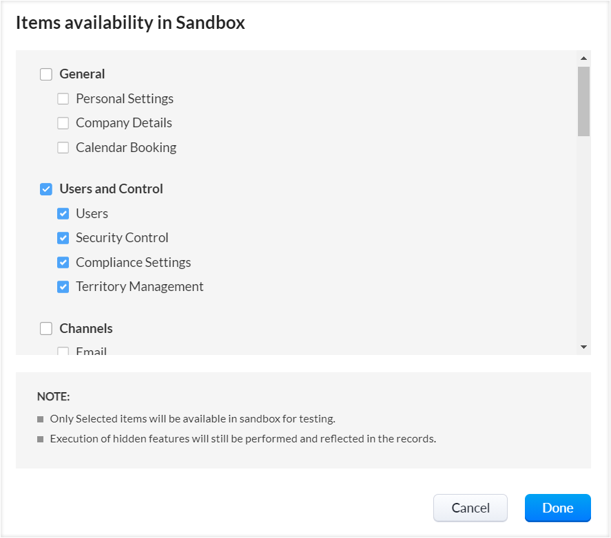2. Selezionare le configurazioni: È possibile selezionare le configurazioni da testare dalla sezione Elementi disponibili nel Sandbox. Ad esempio, per testare le configurazioni relative agli utenti, è possibile selezionare le funzionalità richieste sotto Utenti e Controllo. Solo le configurazioni selezionate appariranno nel sandbox creato.