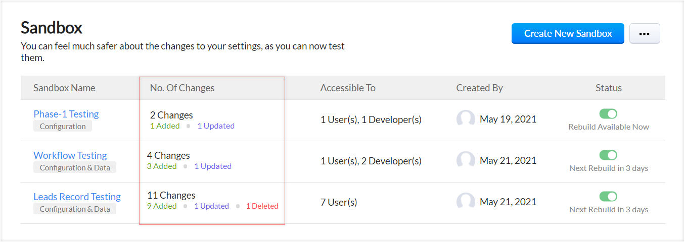Gli utenti che dispongono dell'autorizzazione Manage Sandbox nel loro profilo possono visualizzare l'elenco degli account Sandbox creati andando su CRM Setup > Data Administration > Sandbox. Questa pagina categorizza e visualizza tutte le informazioni necessarie sugli account sandbox come il nome dell'account, le modifiche, gli utenti e gli sviluppatori con accesso, la data di creazione e lo stato.