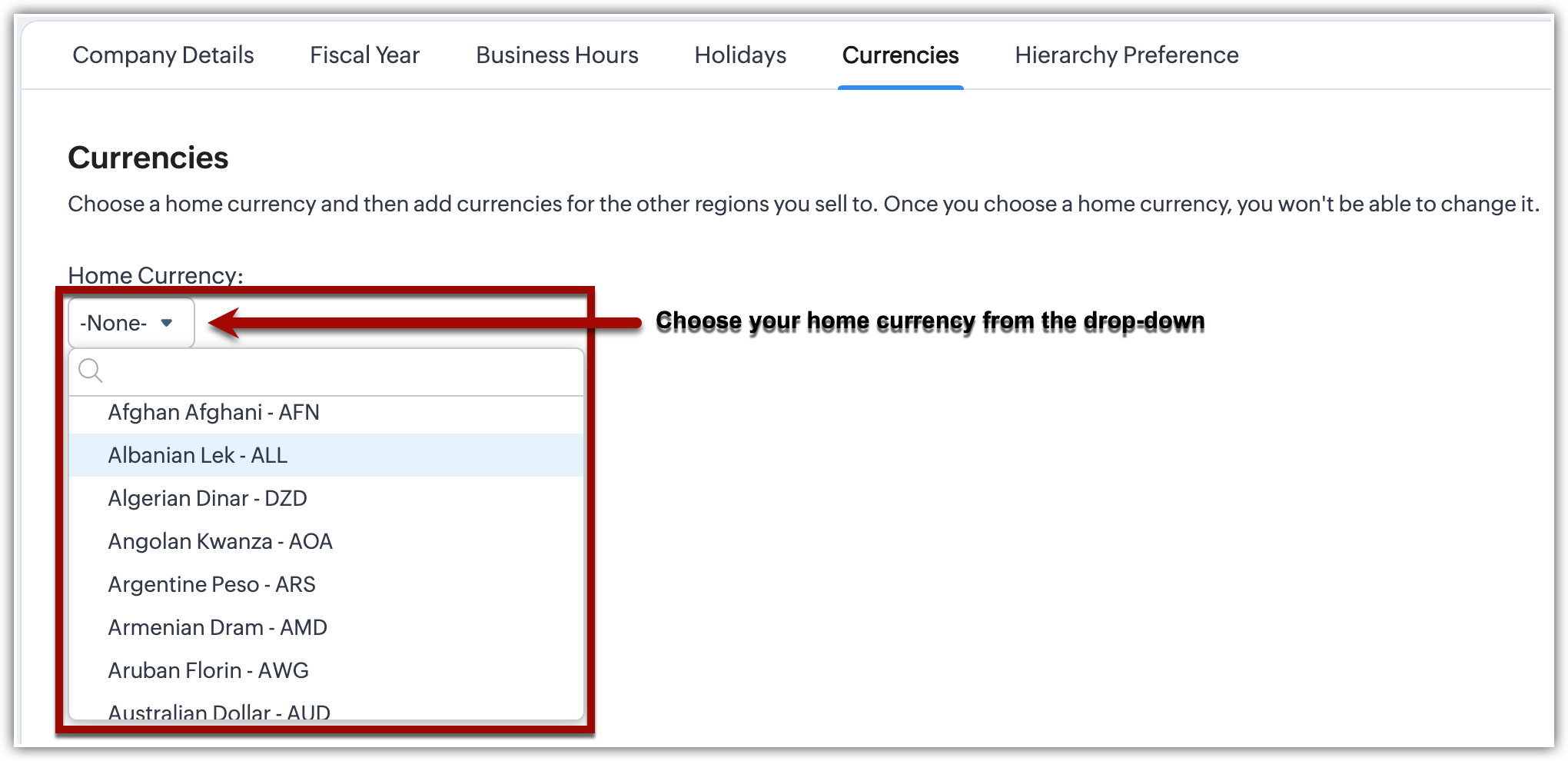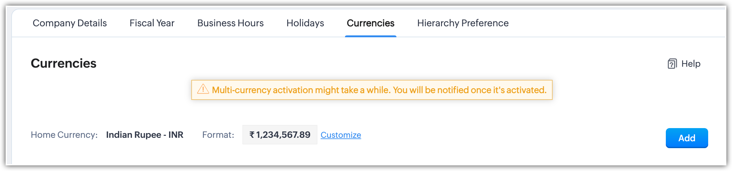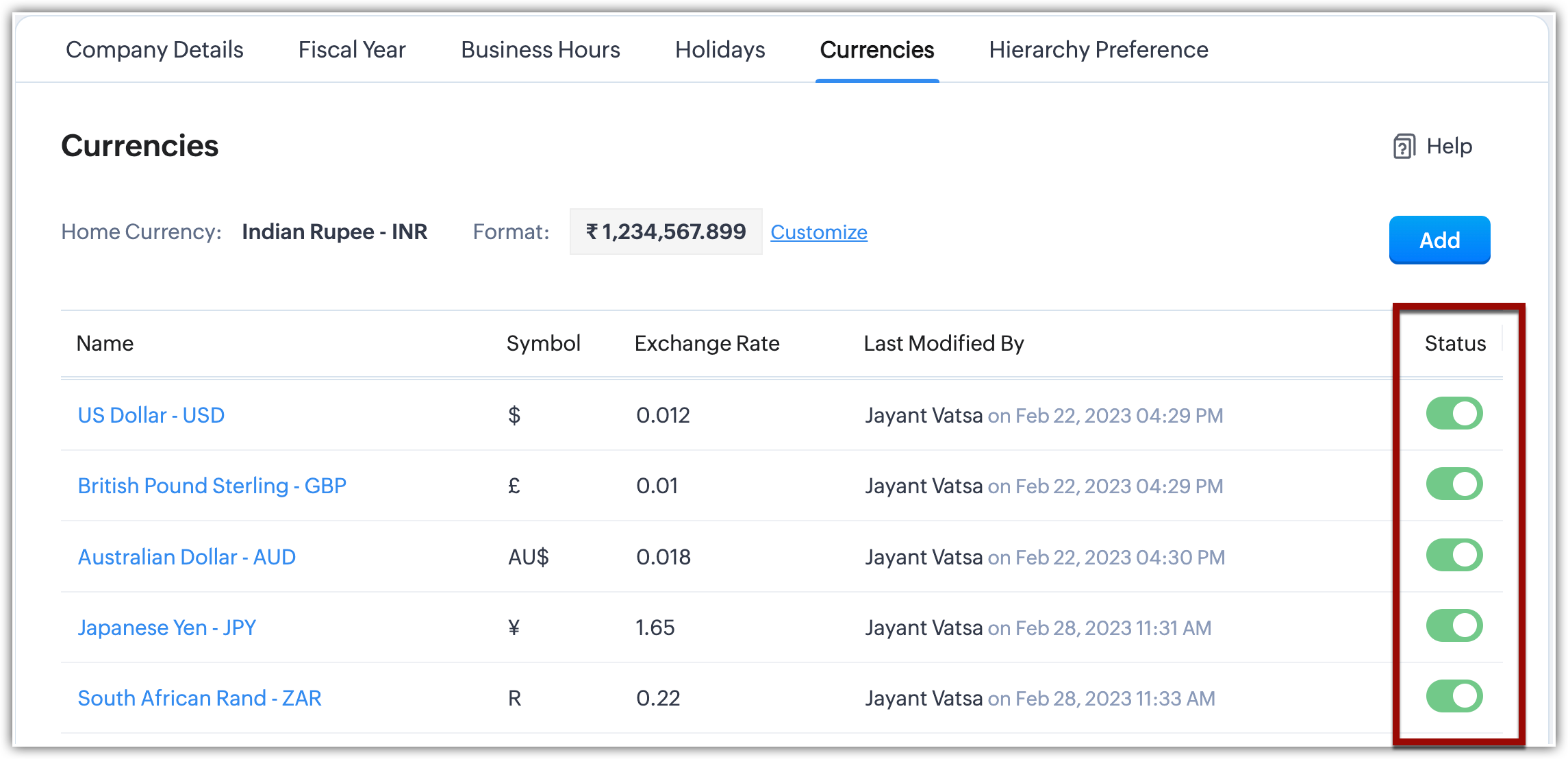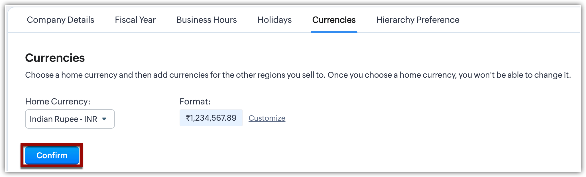 - Nella pagina Company Settings , vada alla scheda Currencies.