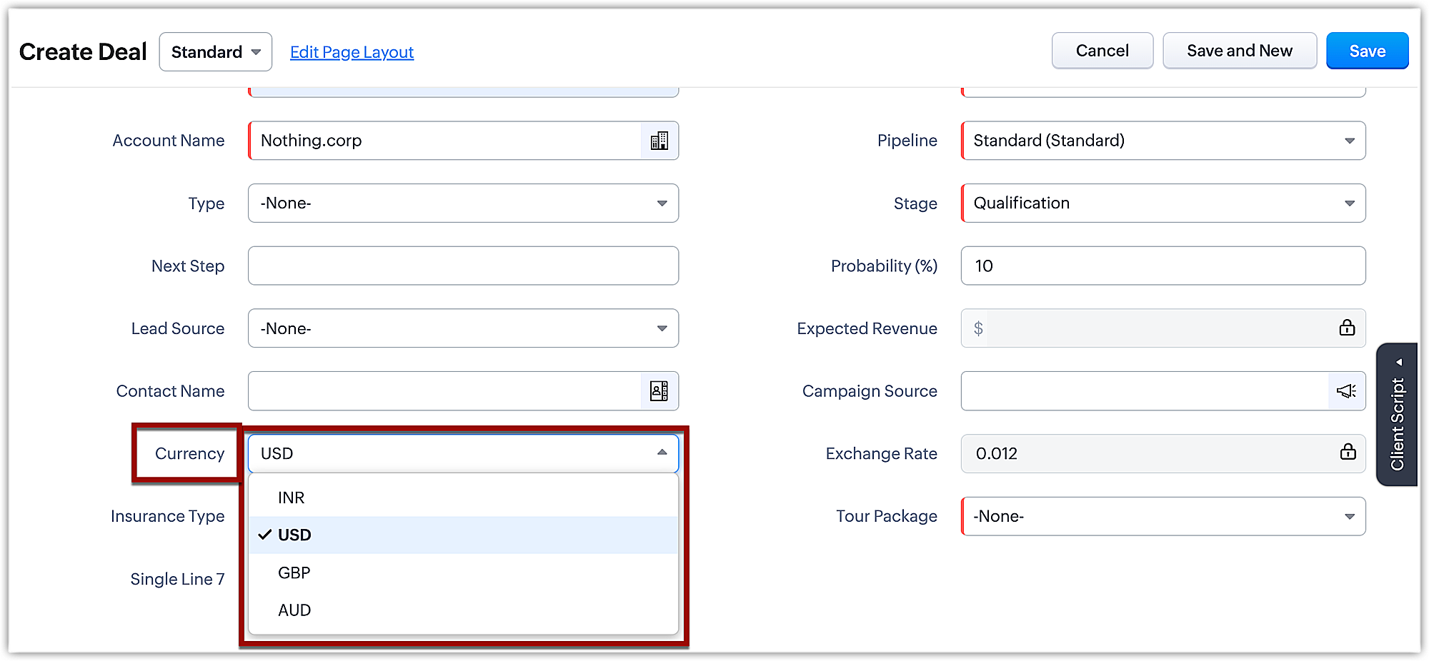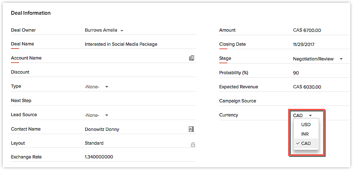 Una volta inviato questo modulo, il campo valuta diventa disponibile nel record come elenco a discesa con tutte le valute attive aggiunte nel Suo account CRM